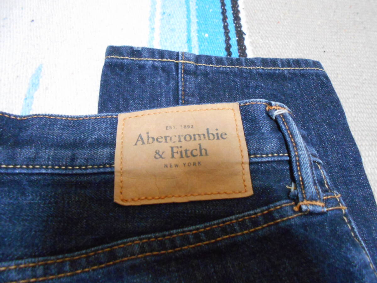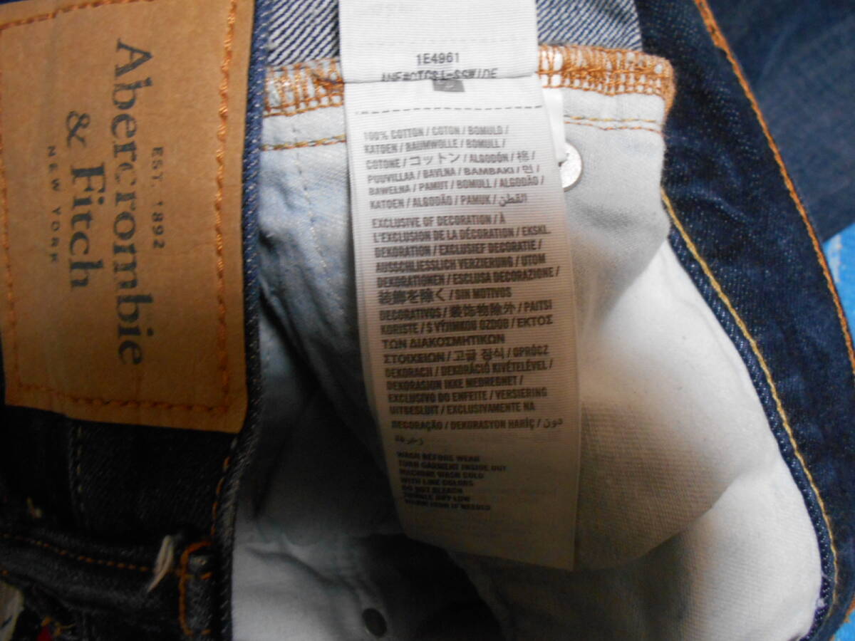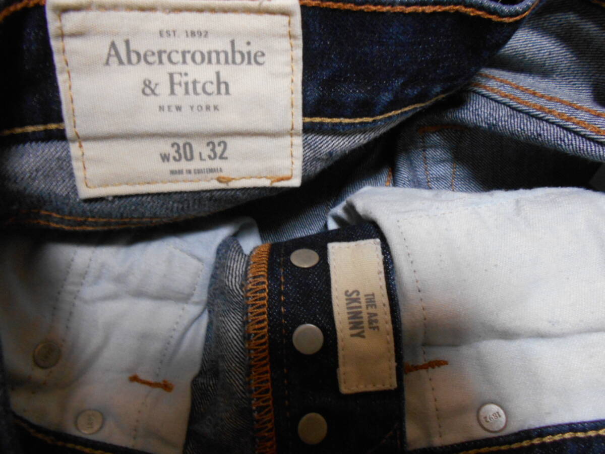 ABERCROMBIE&FITCH NEWYORK SKINNY 特有の股上浅めでタイト過ぎない絶妙なスリムレッグスのシルエットライン、ハイオンスのコットン100% 生デニム素材、クラシックボタンフライ開閉、アウトサイドシーム割縫い、ビンテージデニムの風合い深い濃紺インディゴの発色、ディテールまで極めて良いテイスト