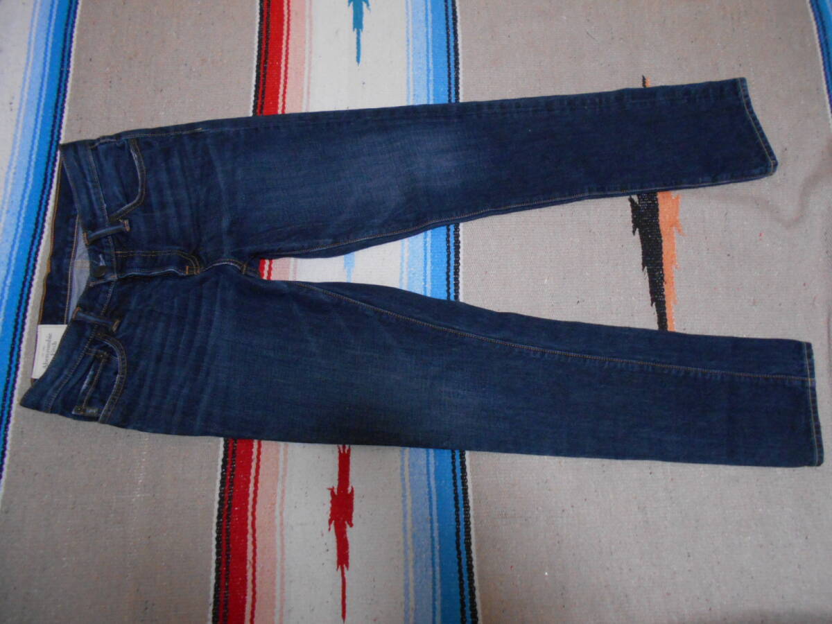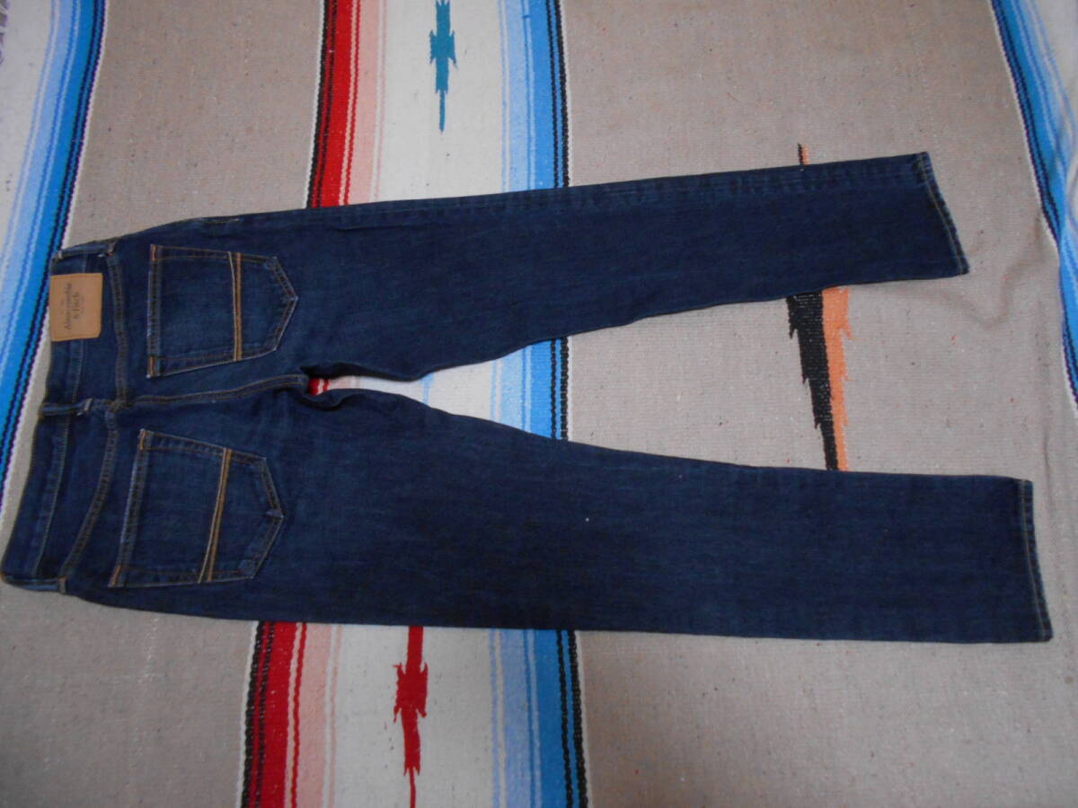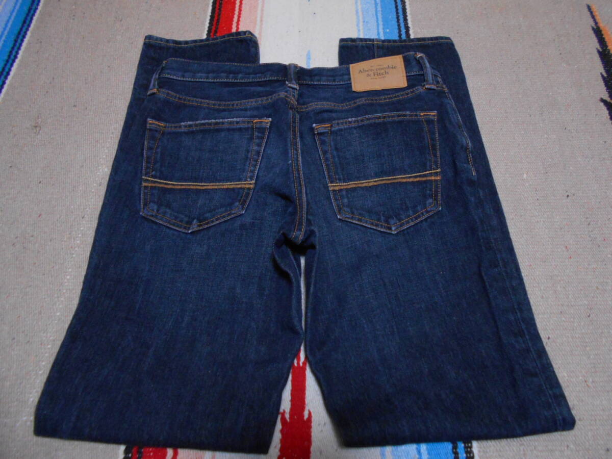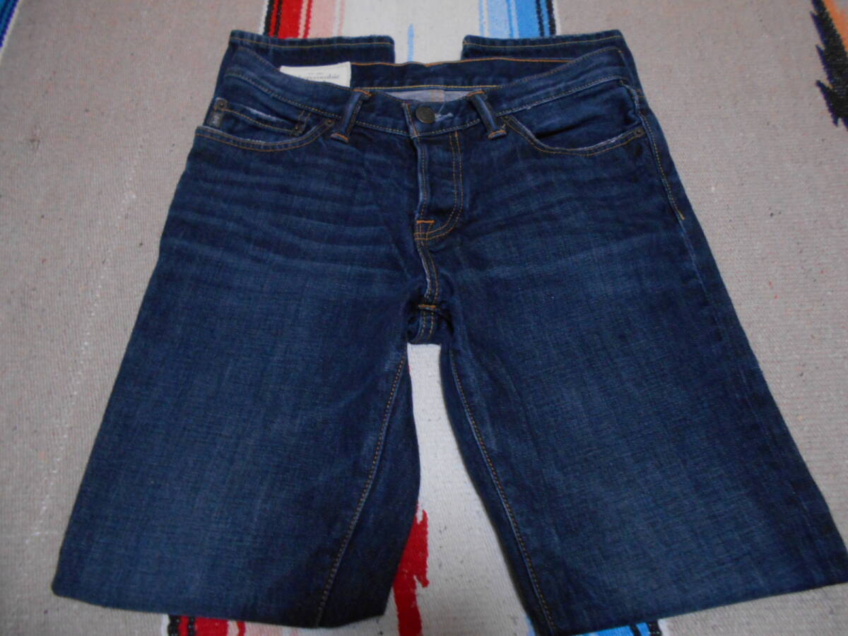 ABERCROMBIE&FITCH NEWYORK SKINNY 特有の股上浅めでタイト過ぎない絶妙なスリムレッグスのシルエットライン、ハイオンスのコットン100% 生デニム素材、クラシックボタンフライ開閉、アウトサイドシーム割縫い、ビンテージデニムの風合い深い濃紺インディゴの発色、ディテールまで極めて良いテイスト