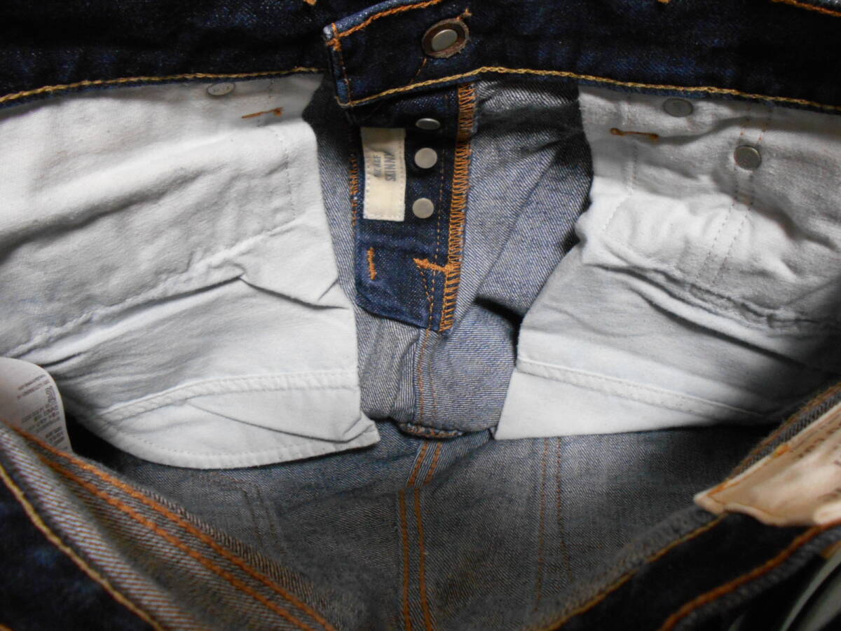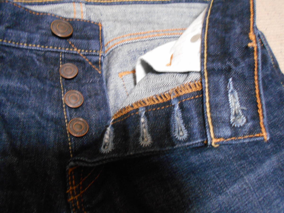サイズ表示は W30 × L32  実測は ウェスト80㎝(股上浅め腰骨上部のフィット)、股下82㎝、股上23cm、裾幅18cm