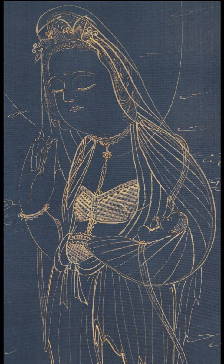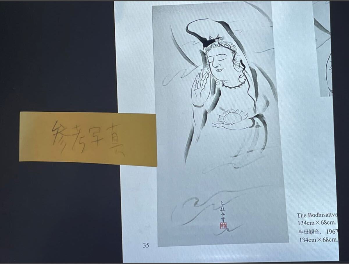 →作風の参考写真2枚目は、1967年作の仏像画の掛軸作品「生母観音」(134㎝×68㎝)のもの。