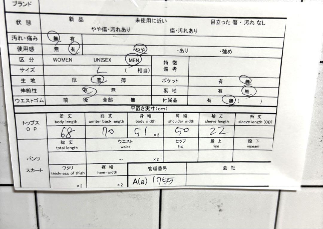 ※アパレルのブランドによりサイズ基準が異なるので、必ず採寸表をご確認の上、ご購入お願いいたします。