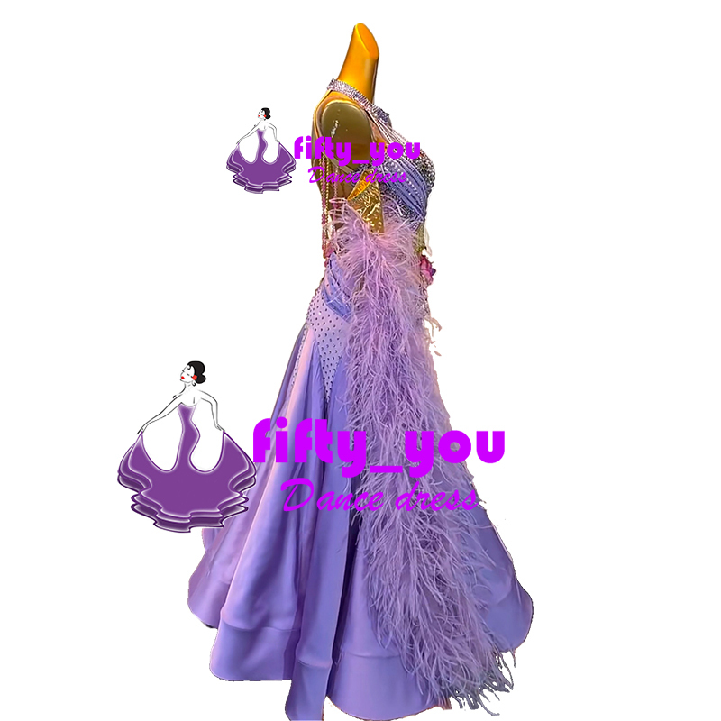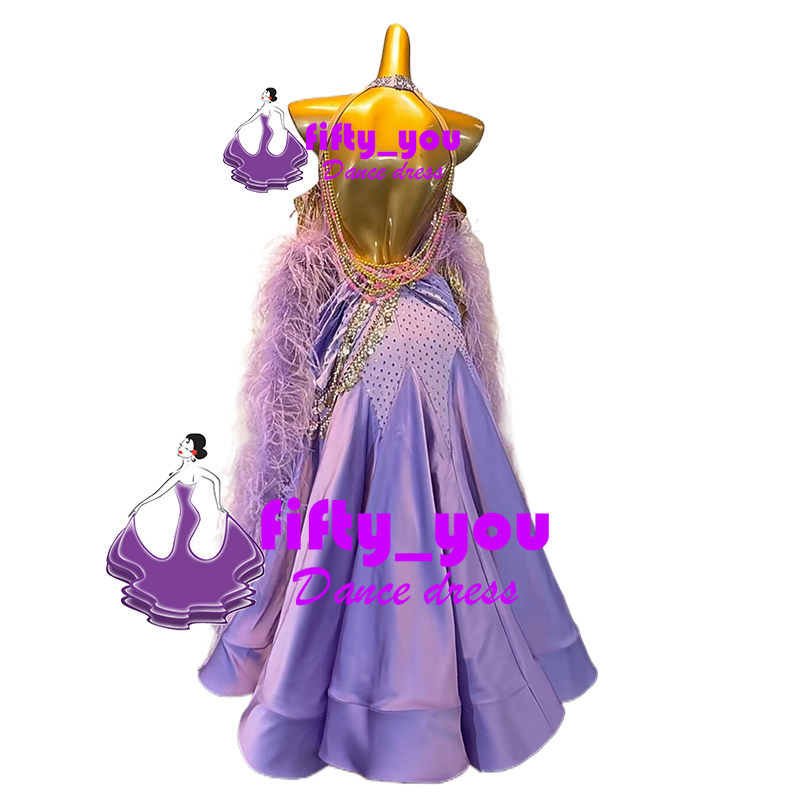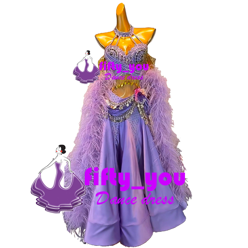 新品fifty_you高級衣装 セミオーダードレス レディース社交ダンスドレス モダン競技ドレス ボリューム羽飾り ビーズ飾り パープル