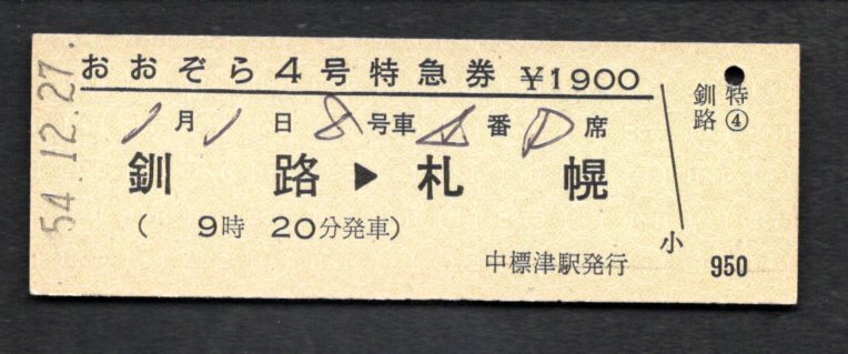 S54 おおぞら4号特急券(中標津駅)完全常備券