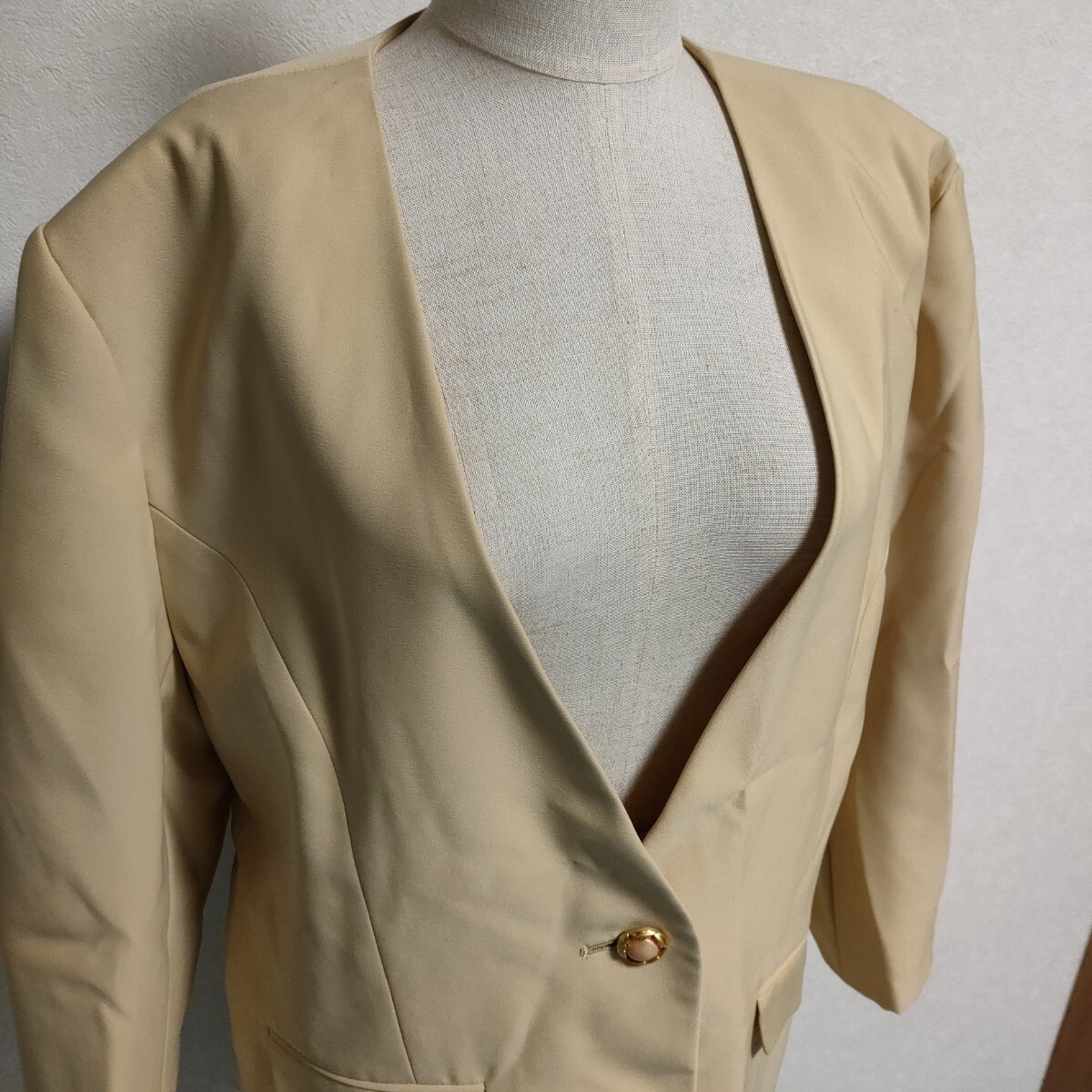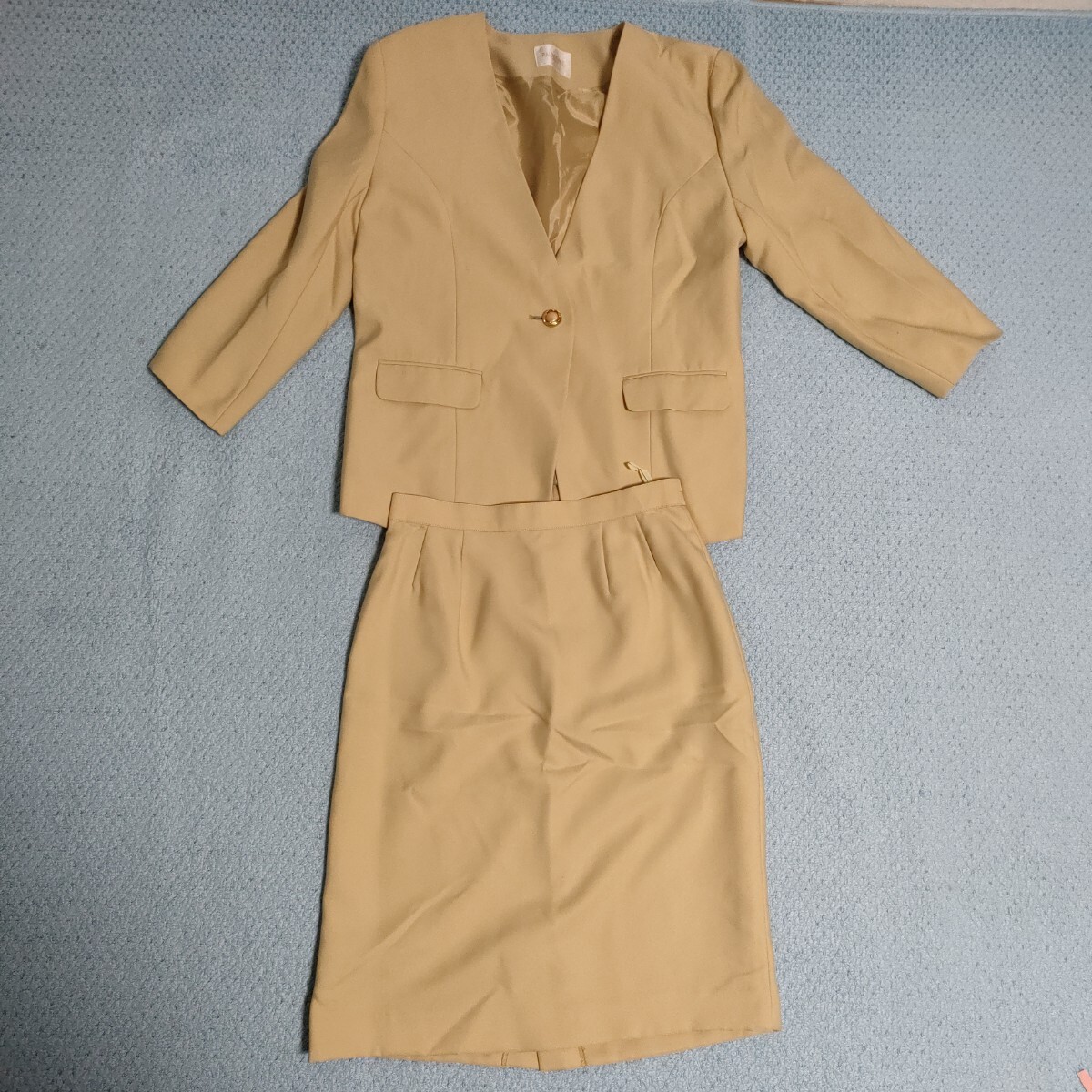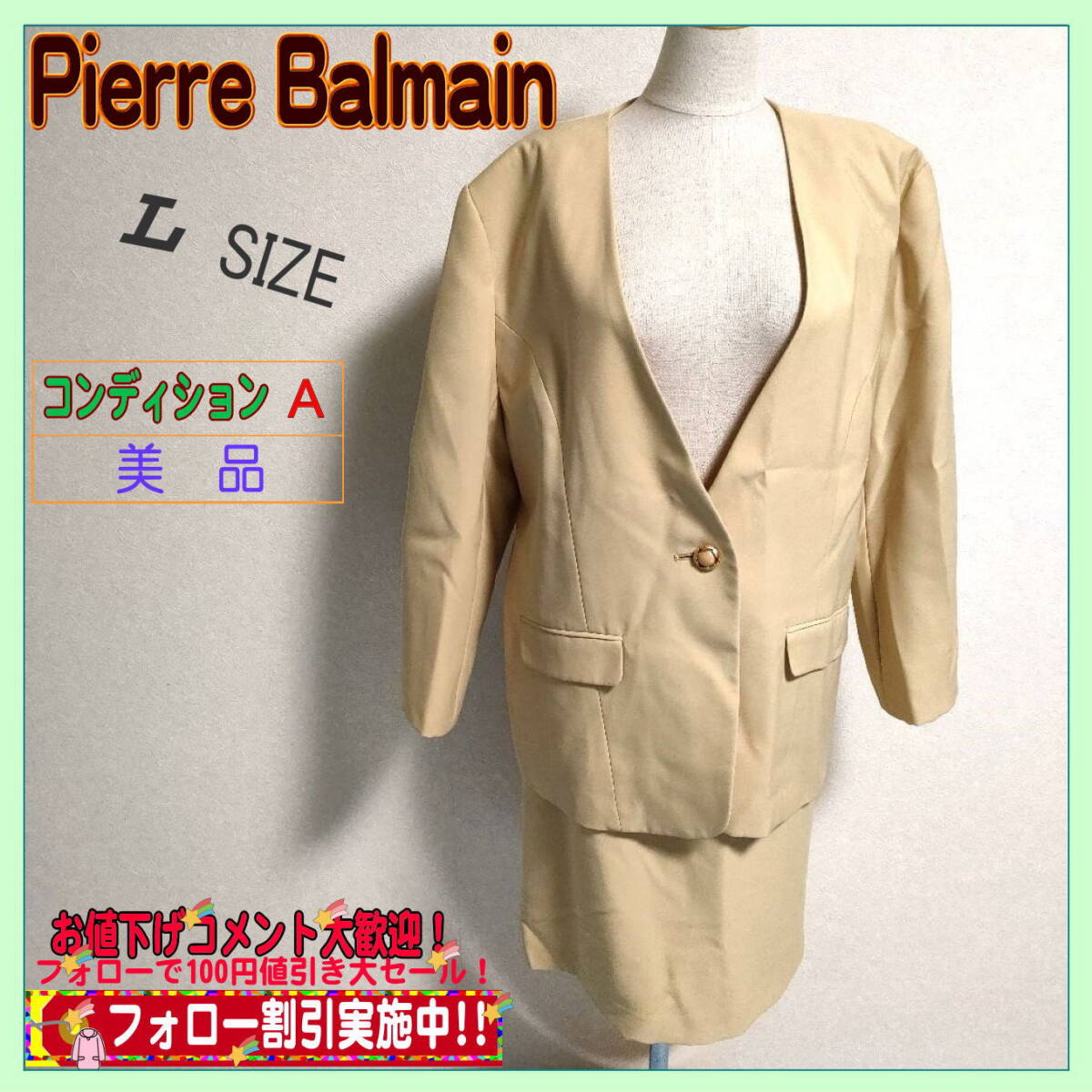 (フォロープレゼント実施中!4色ボールペン) ●2000円以上購入された方にはすてきなプレゼント!4色ボールペン 品名:ランクA ピエールバルマン(Pierre Balmain) レディーススーツセットアップ 色: 薄い黄色 サイズ 上着 平置:肩幅 約44cm: 身幅 約51cm:袖丈 約50cm :着丈約62cm サイズ スカート 平置 平置:ウエスト:約68cm ::着丈約 58cm (スカートにはゴム入っています。少し余裕があります。) ※素人の採寸ゆえに若干の誤差がございますのでご了承下さい。 生地: 上着・パンツ共に ポリエステル 100% 状態:全体的に目立った傷みはございません。全体的には良好なコンディションです。