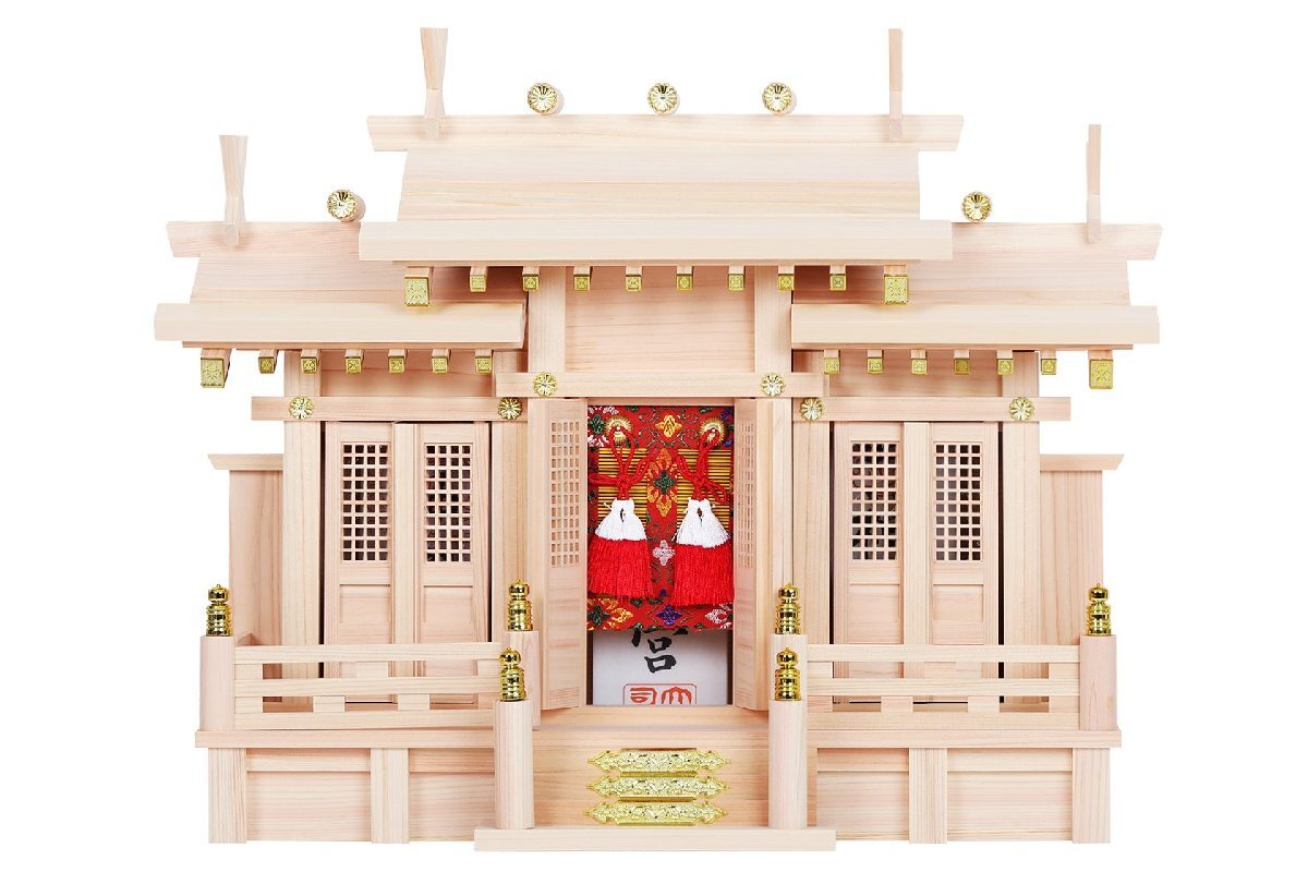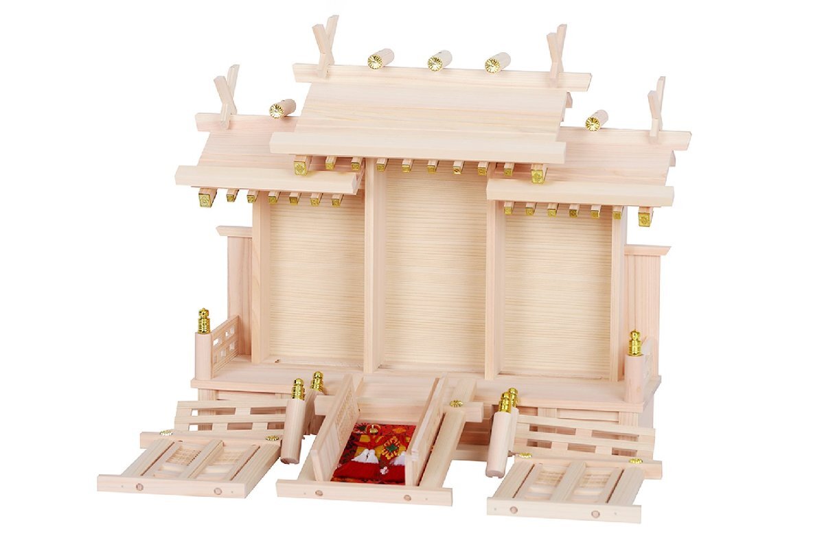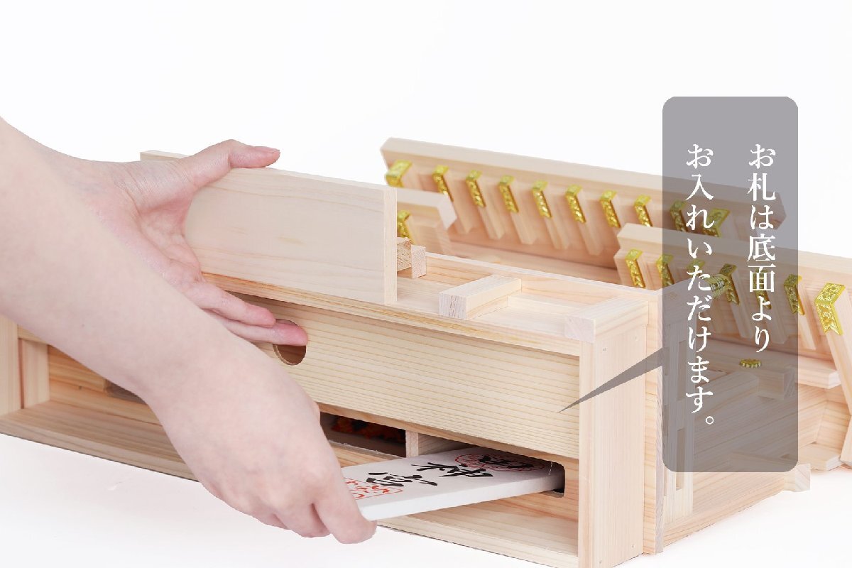 | お社本体 高さ37 幅52 奥行20.5 お神札が入るスペース 中央:高さ24(底面切り込み+5.5) 幅11 奥行6.5 左右:高さ19(底面切り込み+5.5) 幅10.5 奥行4.5 | |||