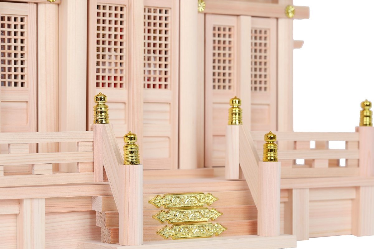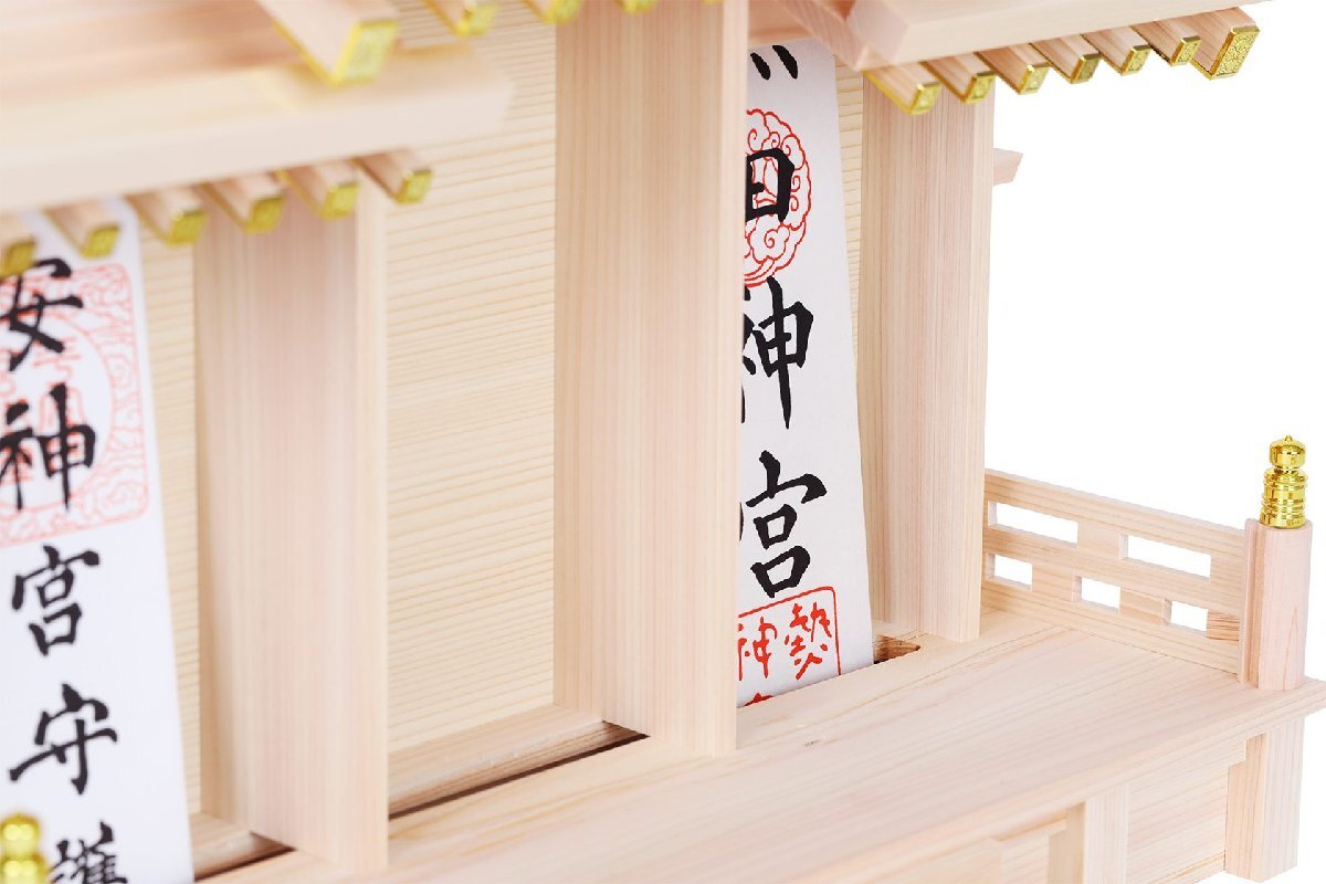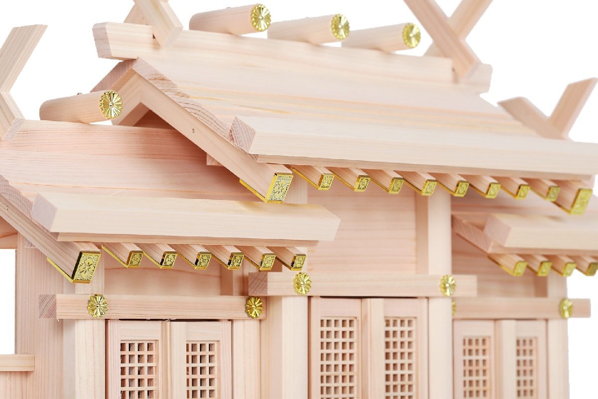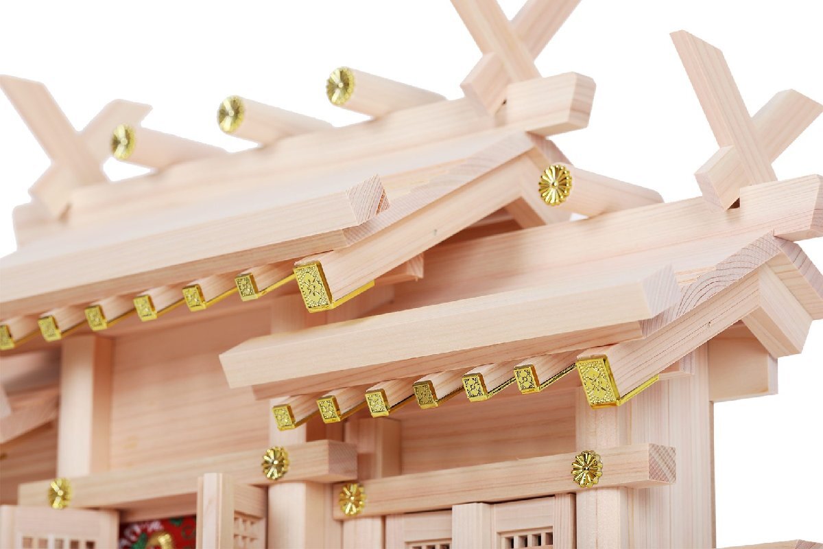 | 中央の天照様のお部屋には美しい、お御簾が飾られています。格子細工の扉と相まって大変美しい、基本形の屋根違い三社です。左右のお部屋に収まらない大きな氏神様等のお神札は、中央にお祀りすることができます。 当店でも人気の宮型となっています。本体のみをお買い替えご検討中の方にも、お勧めの製品となっています。 | |||