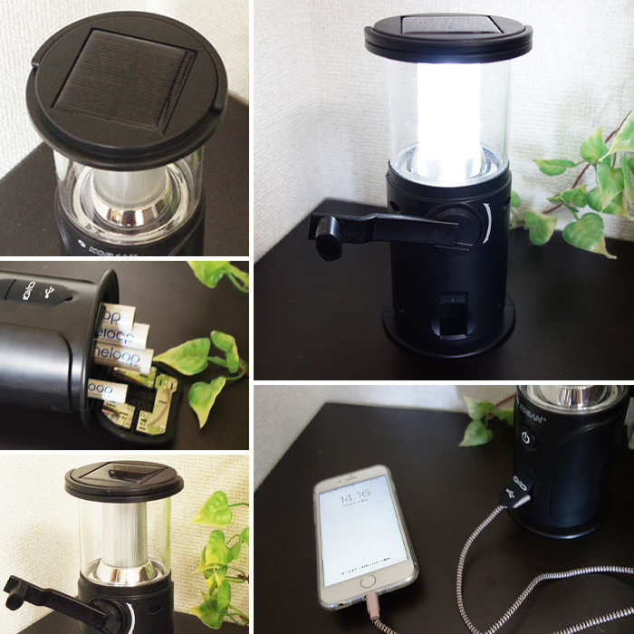 | 灯り・スマホ充電も! 手廻し・乾電池・ソーラーの3電源方式です。 ランタンはLED。 自動手回しスマホ充電。 |