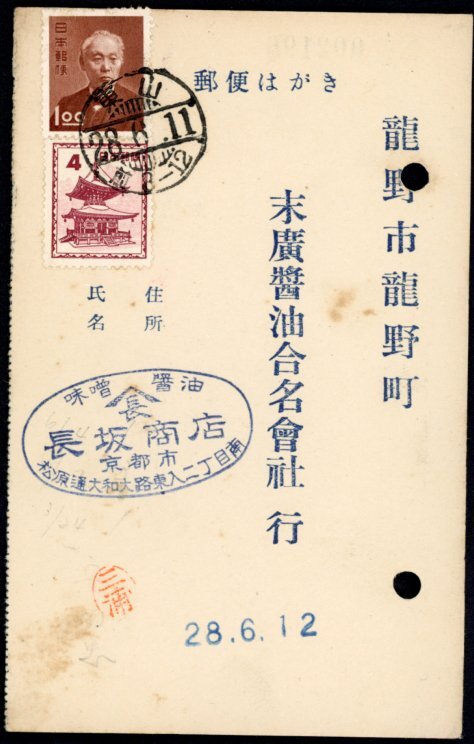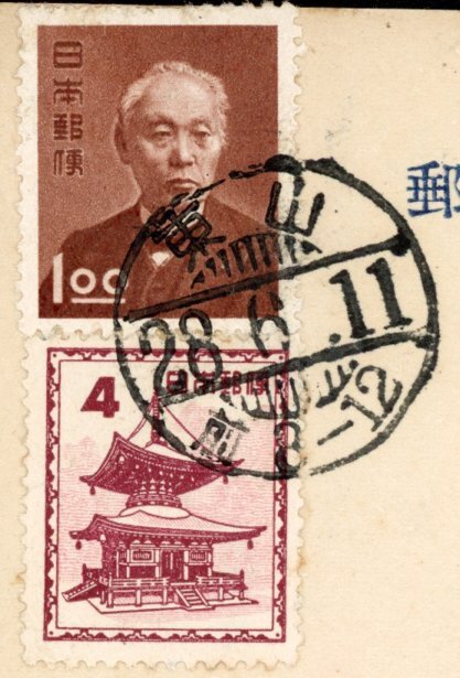 kp19 第1次動植物国宝1円「前島密」定常変種・4円「石山寺多宝塔」貼 東山/28.6.11 はがき