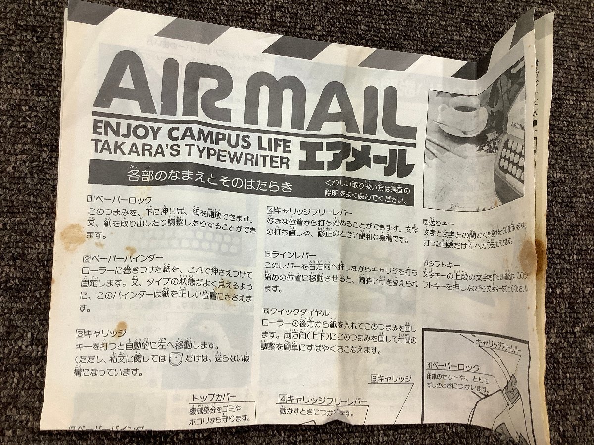 | 商品状態 | 【状態】 TAKARA エアメール 英文タイプです。 昔懐かしいレトロな商品です。 通電確認済み。当時物なので色は薄いですが文字が打てるのを確認いたしました。 別売りのインクを購入した方がいいかと思います。 レトロな商品ですので現状品扱いでお願い致します。 またこちらの商品は現状品扱いの商品となる為、返品不可商品となります。 詳しくは写真をご覧ください。 ※状態については主観的なものですので神経質な方は入札をご遠慮ください。 ※商品画像につきましては、お使いのディスプレイや、カメラの性能、光の加減などにより写り方に違いが出る場合がございます。予めご了承ください。 |
