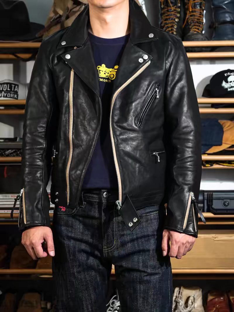 厚み約1.6mmで牛革最上級のイタリアン茶芯カーフスキンで作られた、1970年代サイクロンスタイルがモチーフのダブルライダースです。