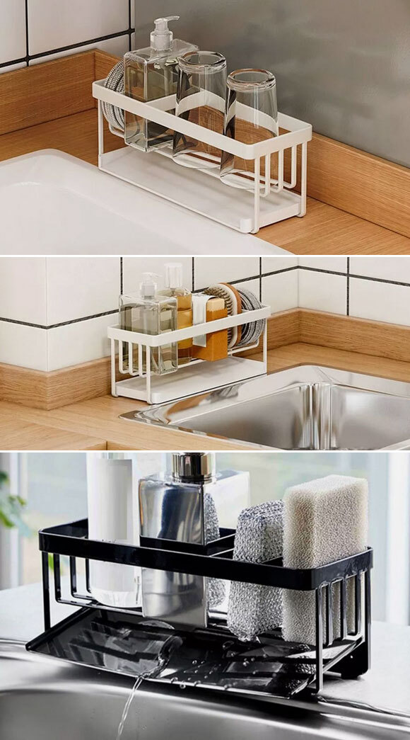 スポンジ&ボトルラック ホワイト 水切りトレイ付き キッチン周りをすっきり整頓 AP-UJ1094-WH