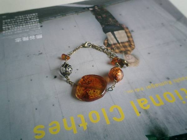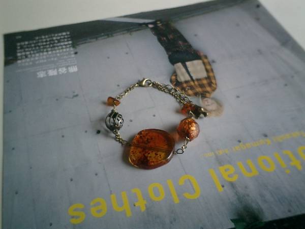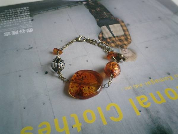 ジャンヌのコレクション・・シリーズです♪琥珀色セレクト・シックな琥珀のブレスレットです♪大人っぽいイメージの琥珀に遊びを取り入れてデザインしました♪琥珀は7ミリから14ミリ位までのさざれです♪ランダムに繋いだ琥珀に透かしメタルや琥珀色の樹脂ビーズを合わせました♪長さは全長23センチ位で調節自由です♪お揃いのブレスレットやネックレスやイヤリングも出品しています♪シンプルで長く着けていただけるデザインを考えて作りました♪ハンドメイドをご理解頂いてノークレーム、ノーリターンでお願いします