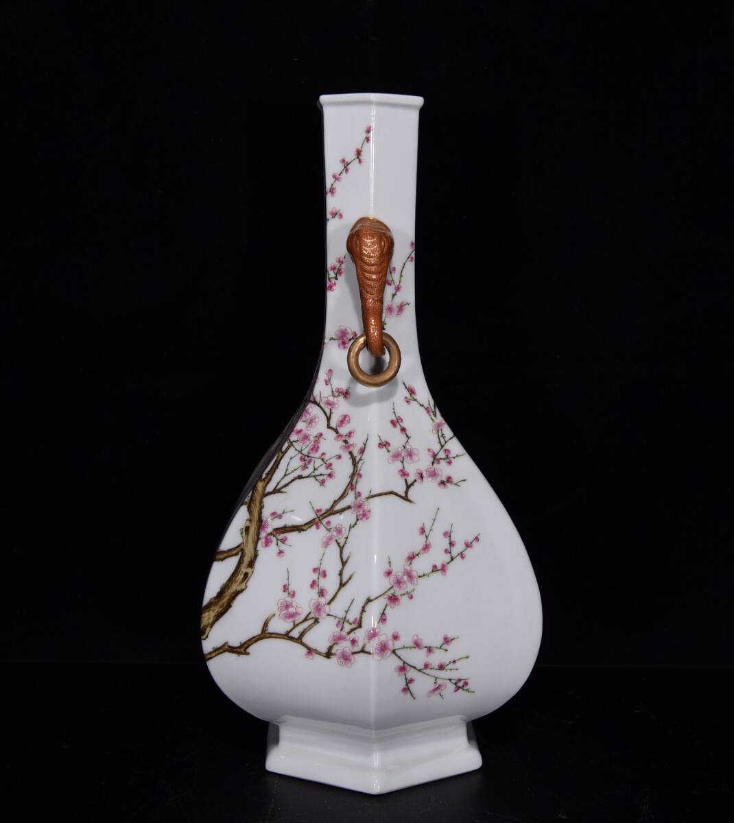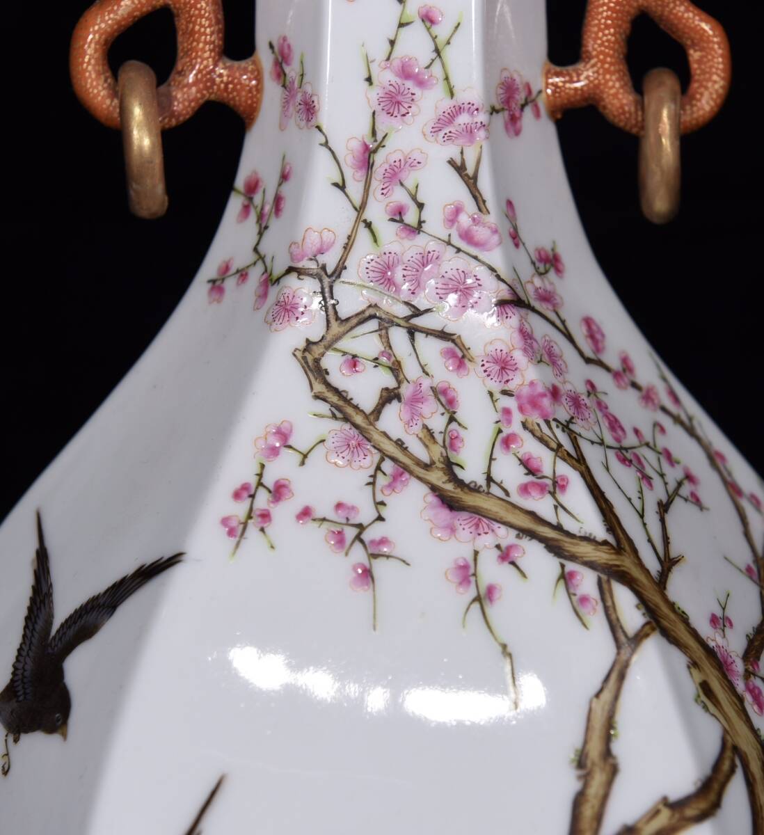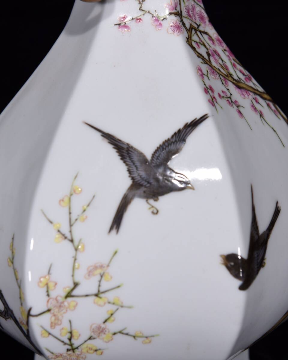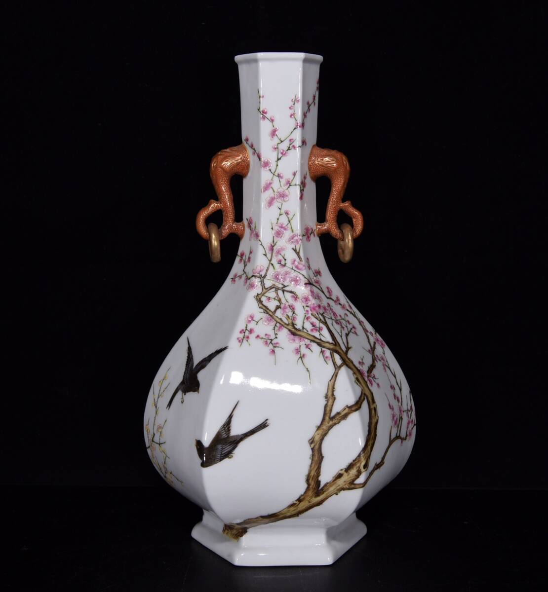 ◆旧家蔵出◆古美術 中国古玩 大清乾隆年製款 粉彩 花鳥紋六方双耳瓶 骨董 古賞物 時代物 A06