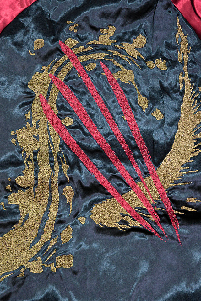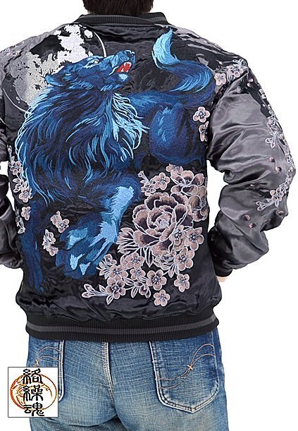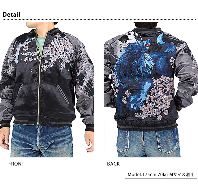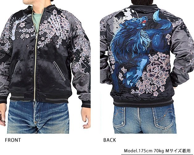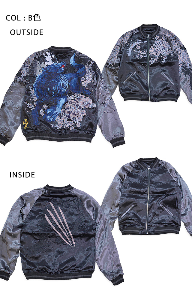 絡繰魂さんから「粋 桜牡丹日本狼リバーシブルスカジャン(244032)」のご紹介です。 重みを感じる程の刺繍量が魅力的な粋シリーズから、最新作のスカジャンが登場しました。 今回モチーフの主役に採用されたのは、近年人気を博している狼柄。 背中には疾走感溢れる日本狼の姿をダイナミックに刺繍しました。 フロントには桜と狼の爪痕を刺繍で落とし込みました。 表面はしっかり柄の入ったスカジャンですが、対象的に裏面はシンプルに仕上げ、メリハリを付けました。 ボディーにはレーヨンサテンを使用し、ドレープや陰影がくっきりと現れています。 | ||||||||||||||||||||