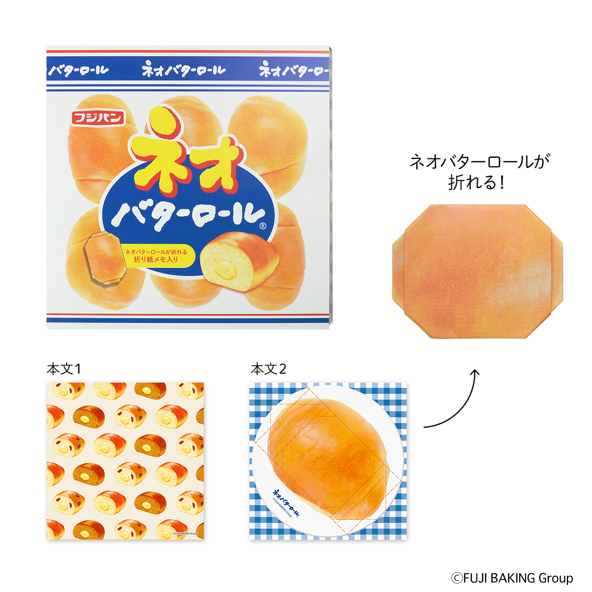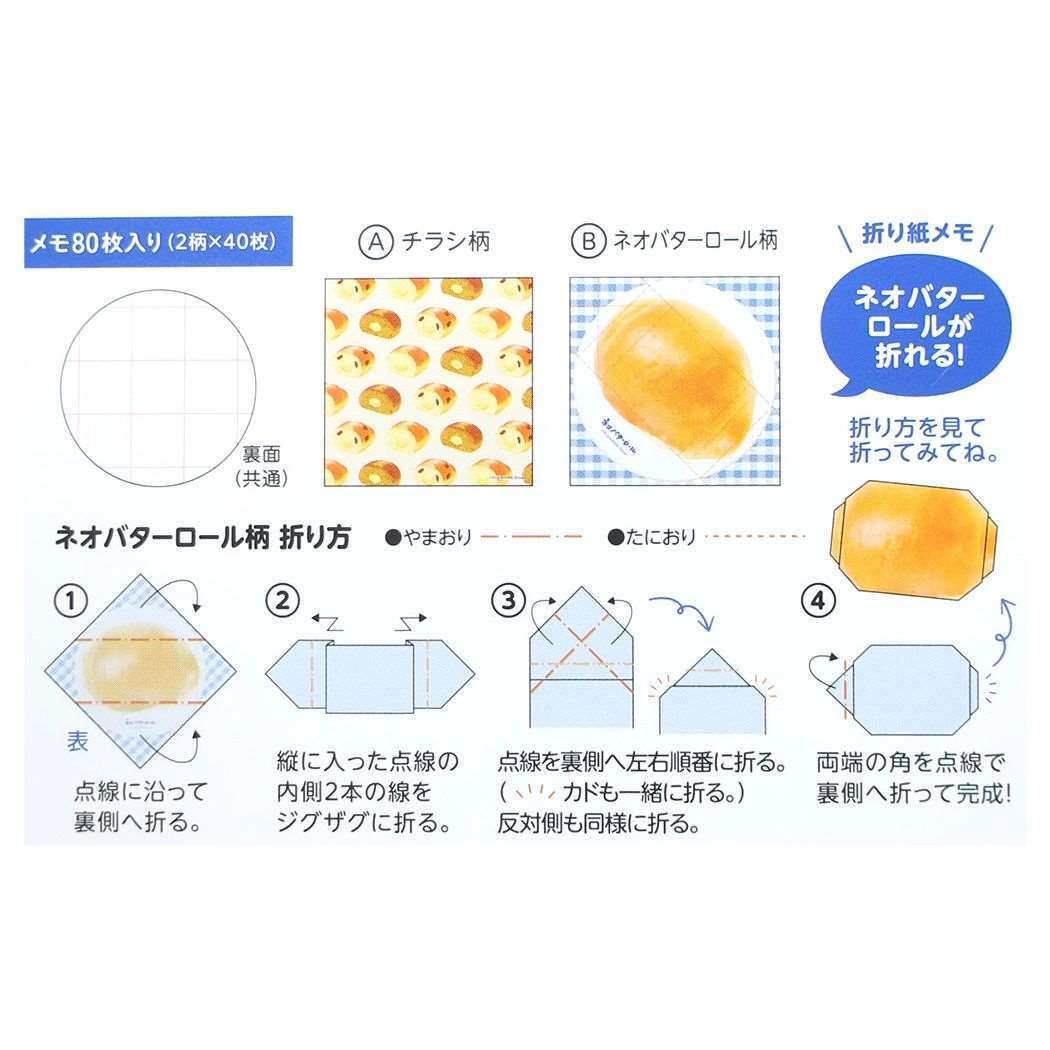 リアルなパッケージとネオバターロール模様のメモと、折るとパッケージやバターロールになる遊び心のある折り紙メモの2種類が入っています。