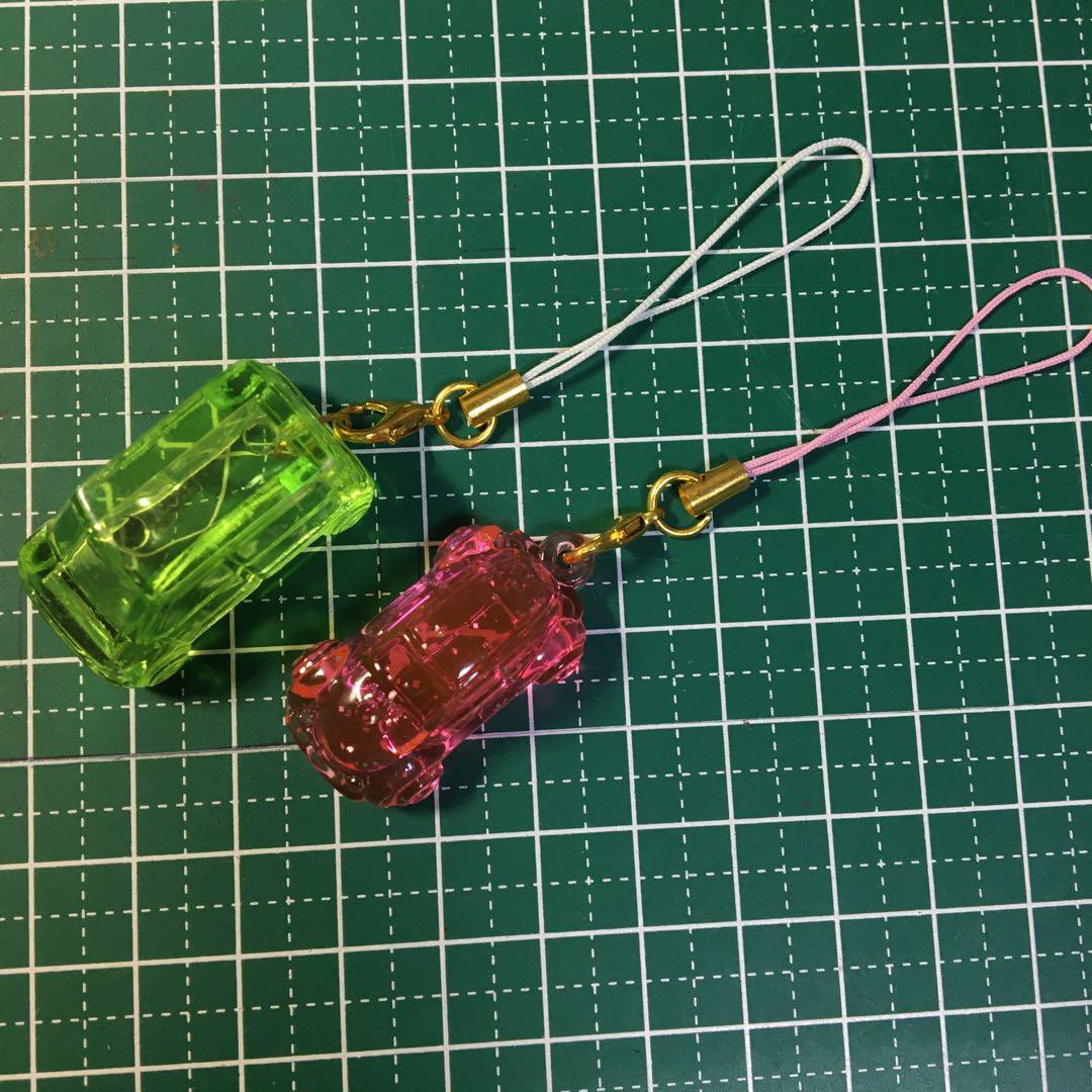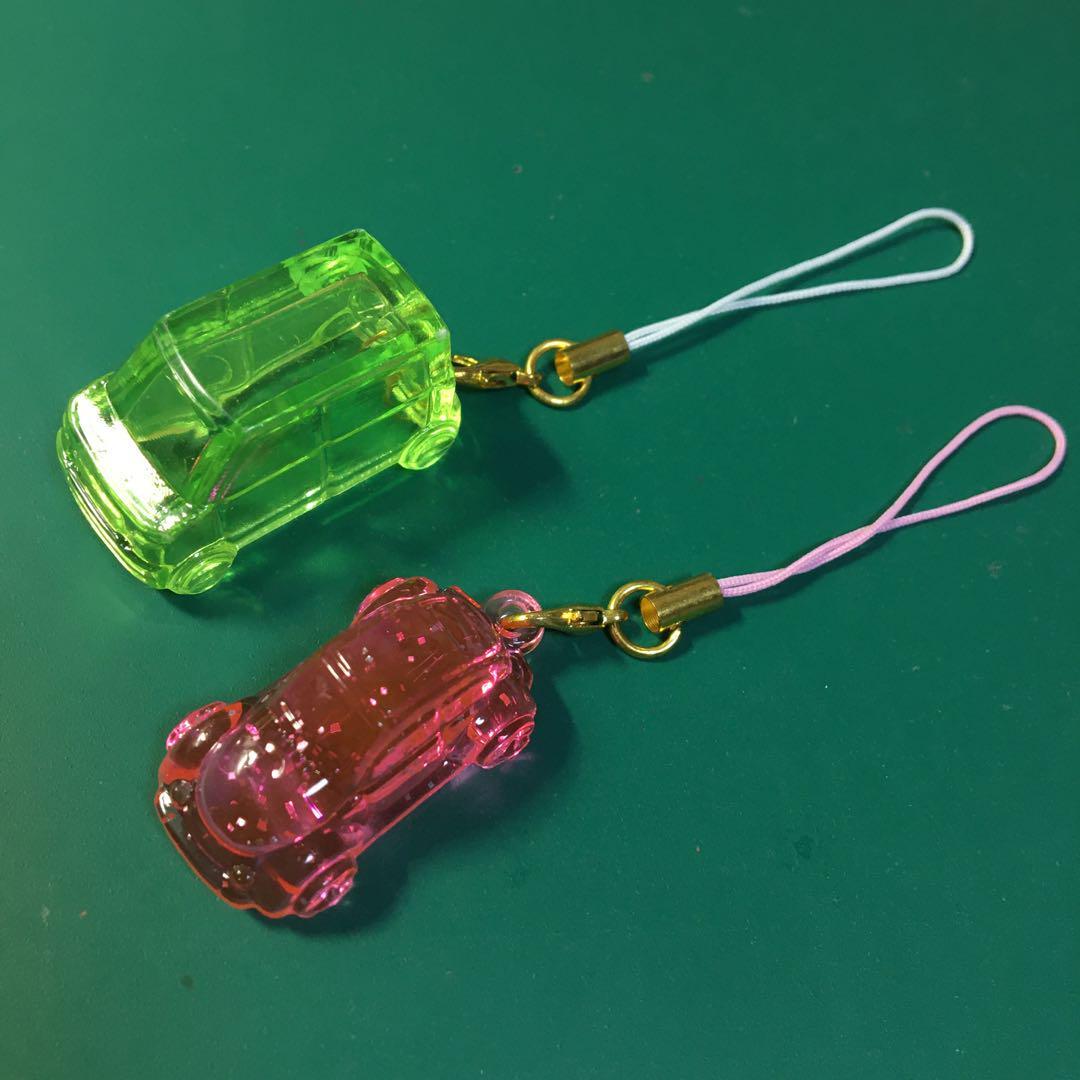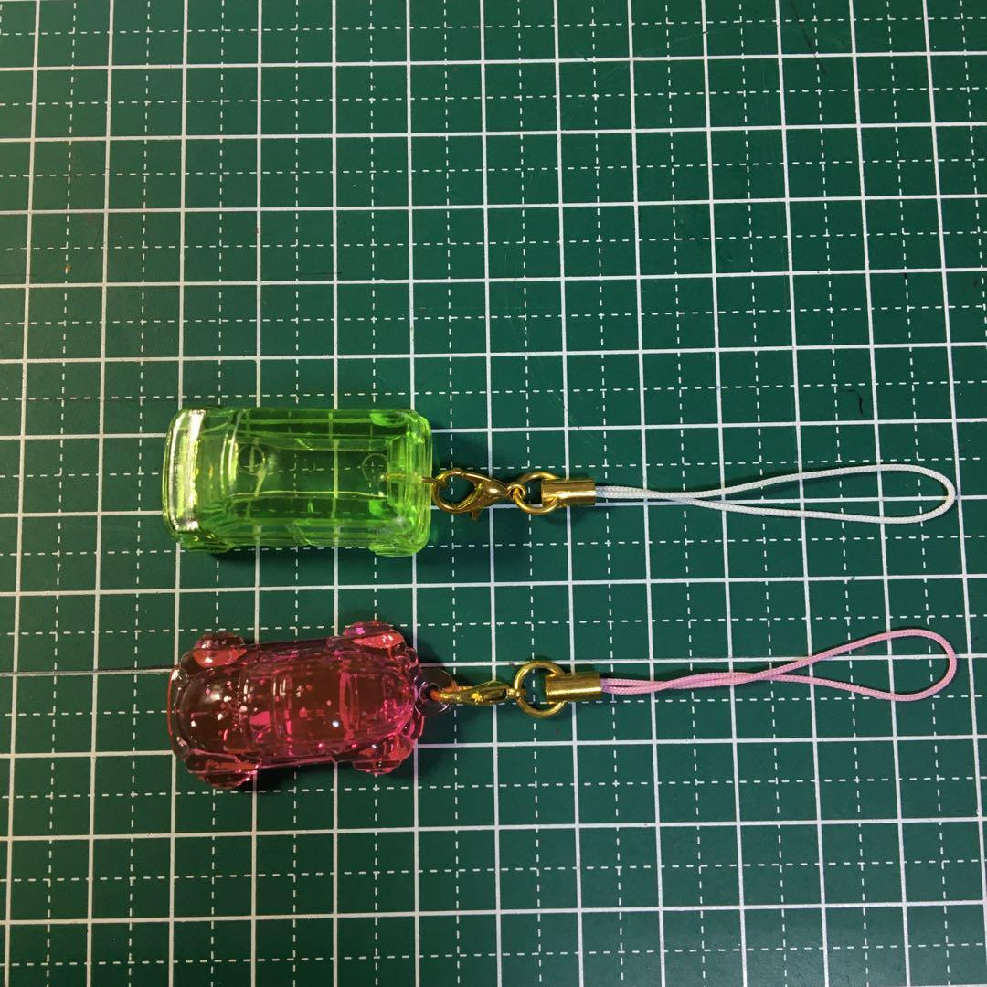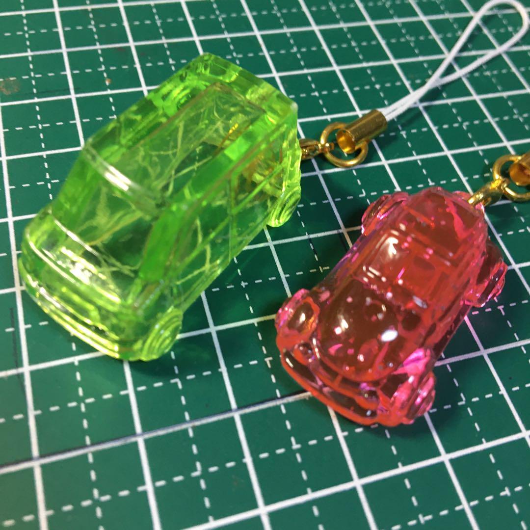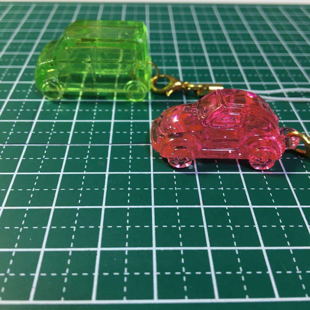 この車型のストラップは、緑色とピンク色の2種類があり、どちらも透明感のあるプラスチック素材で作られています。個性的なデザインが目を引きます。