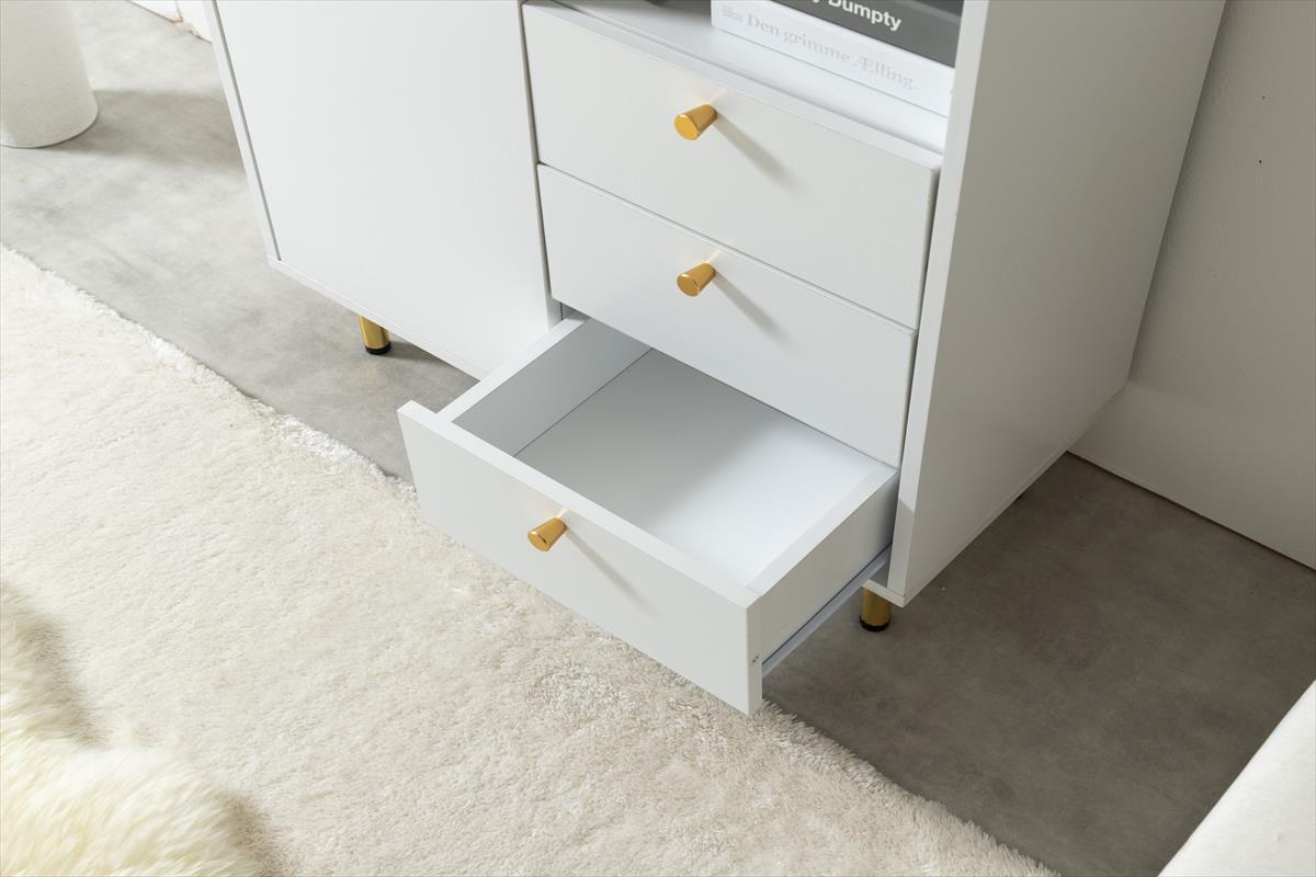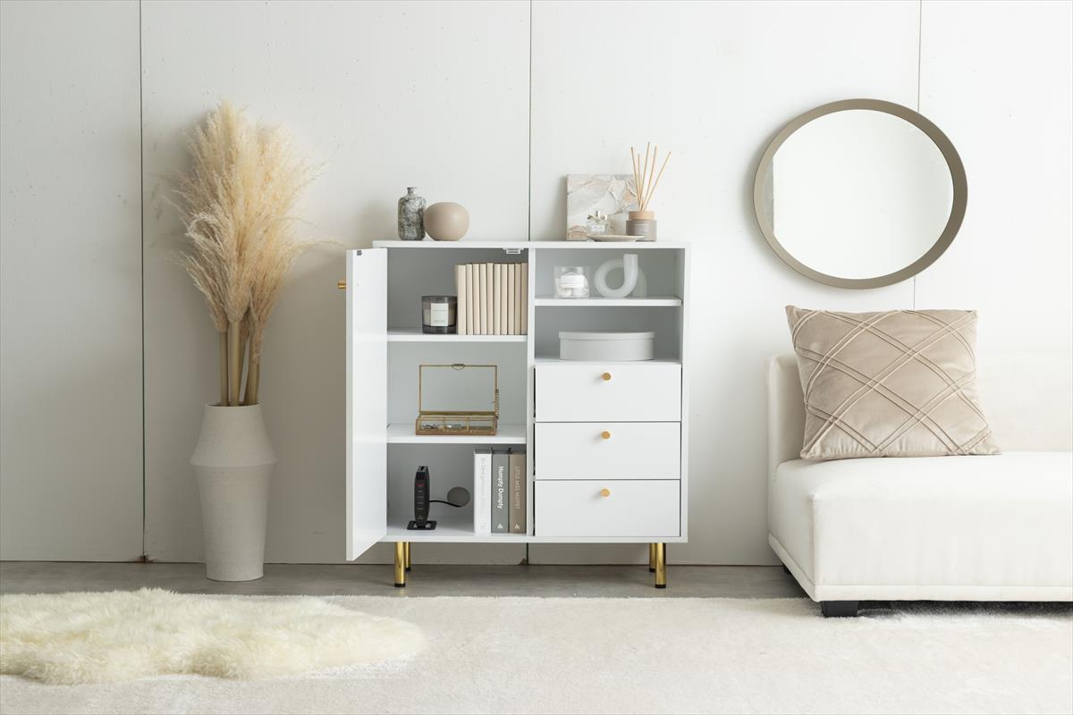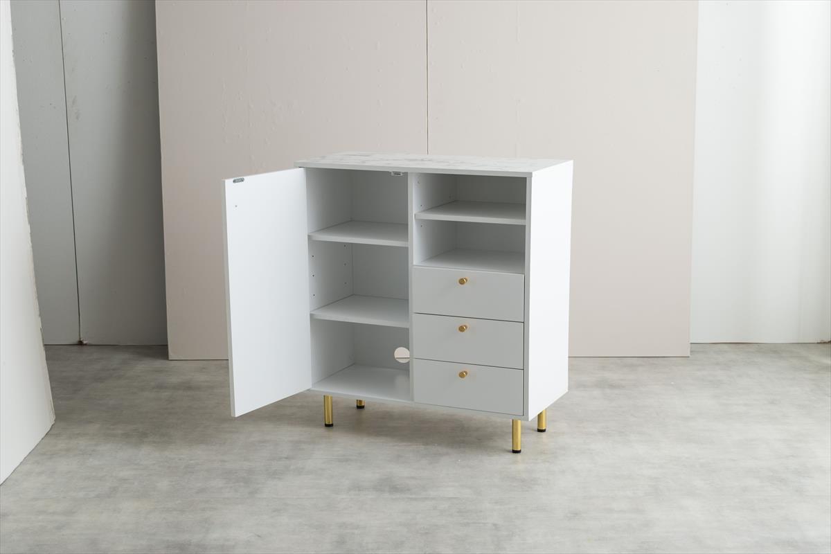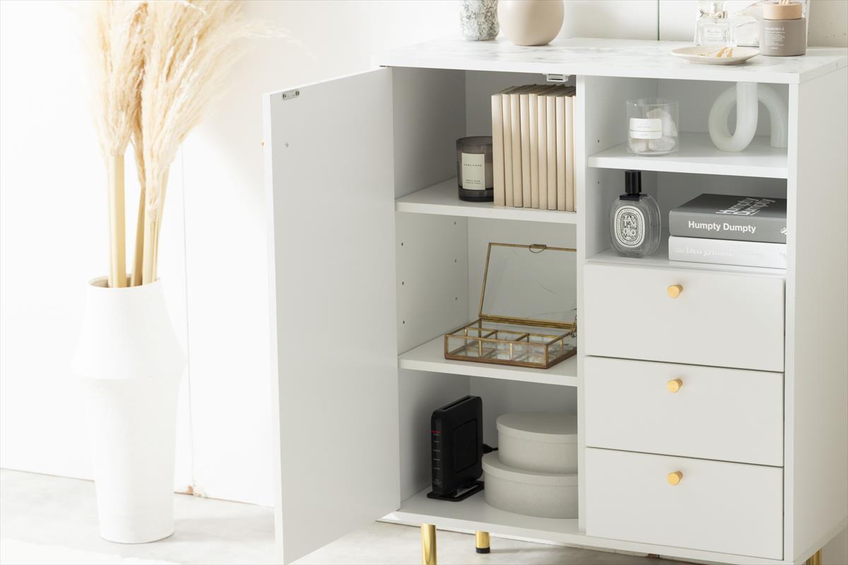 天板の大理石柄とゴールドのあしらいが特徴の『Camila(カミラ)』シリーズのキャビネット。