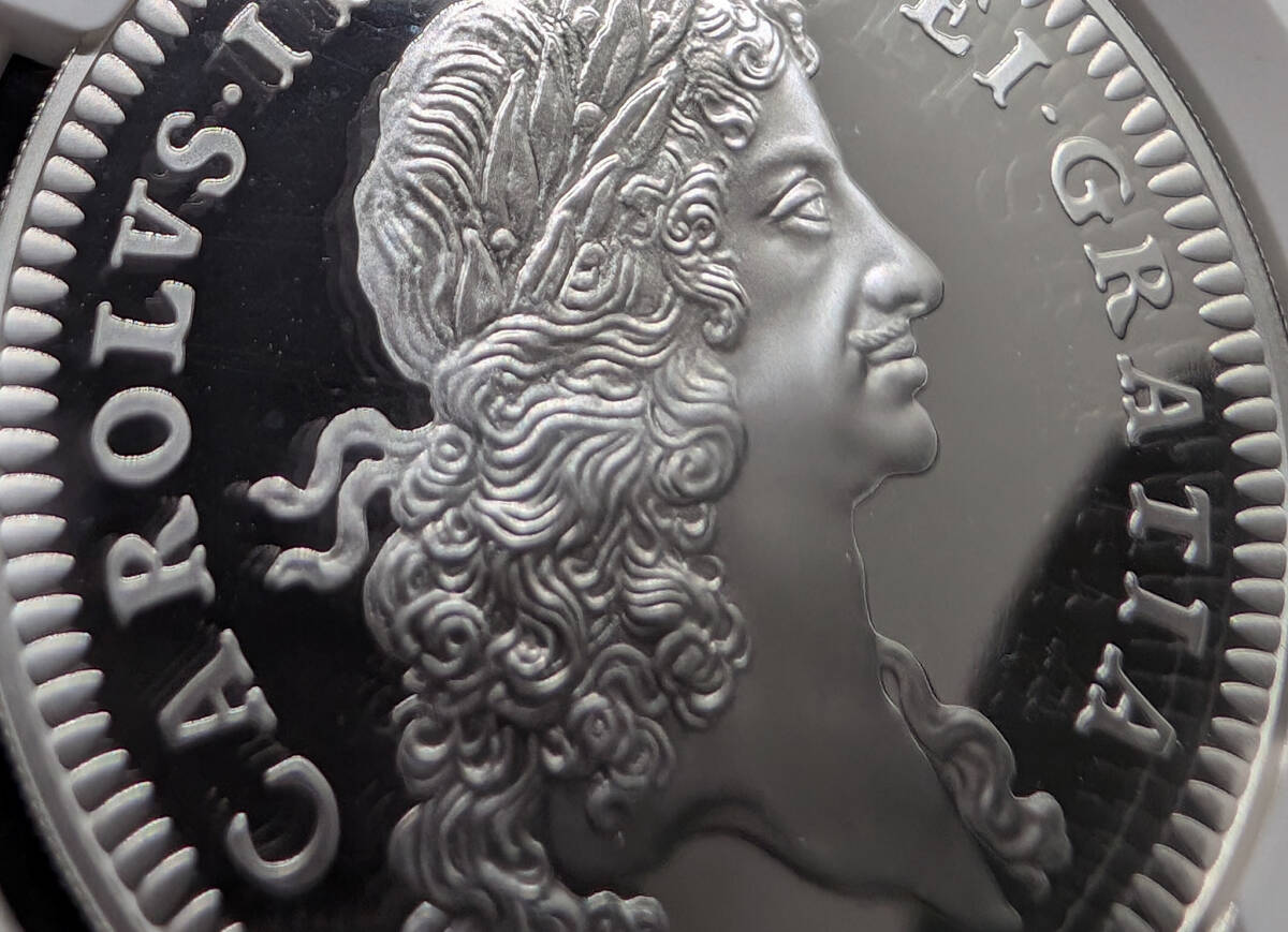 さて、コインの表面のチャールズ2世について紹介しましょう。時は17世紀、チャールズ2世の時代、この時代はキリスト教会のさまざまな宗派が複雑に絡み合い、紛争が絶えませんでした。チャールズ2世はその位の高さゆえに宗教弾圧や反乱に巻き込まれ、何度も他国に亡命しています。父であったチャールズ1世は処刑され、共和制が敷かれていた時期もあったようです。しかし運よく、共和制の後継者の失策により、チャールズ2世は王政復帰することができました。