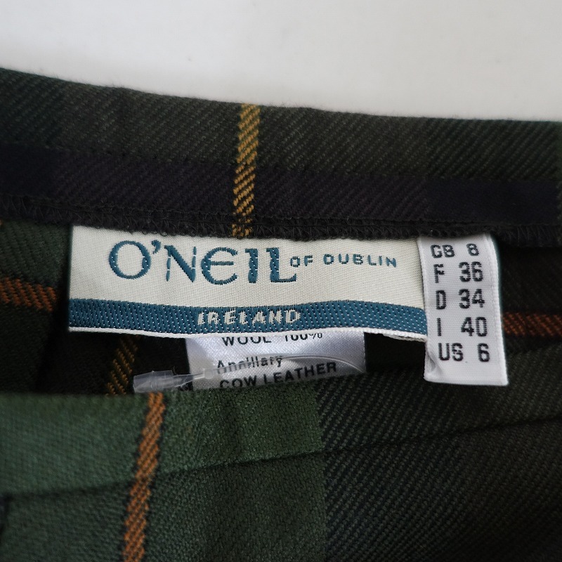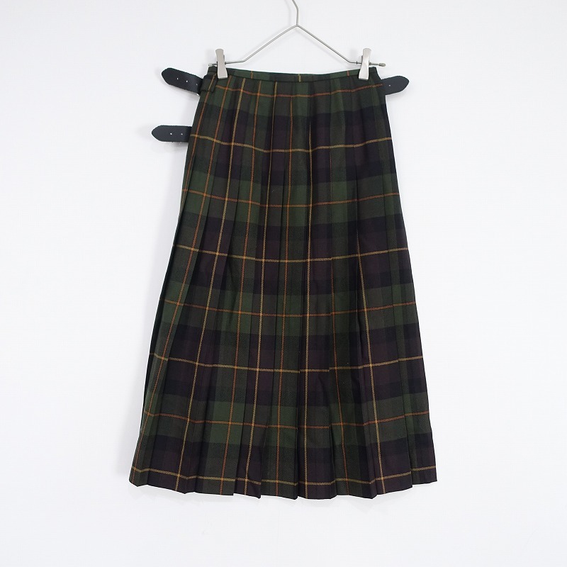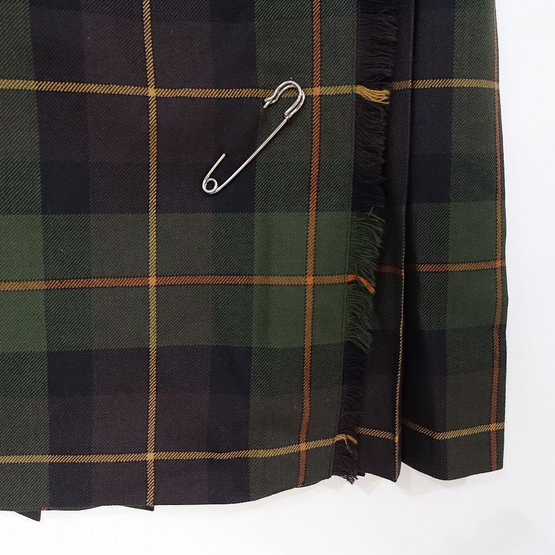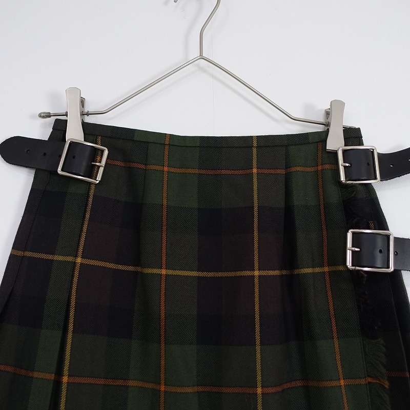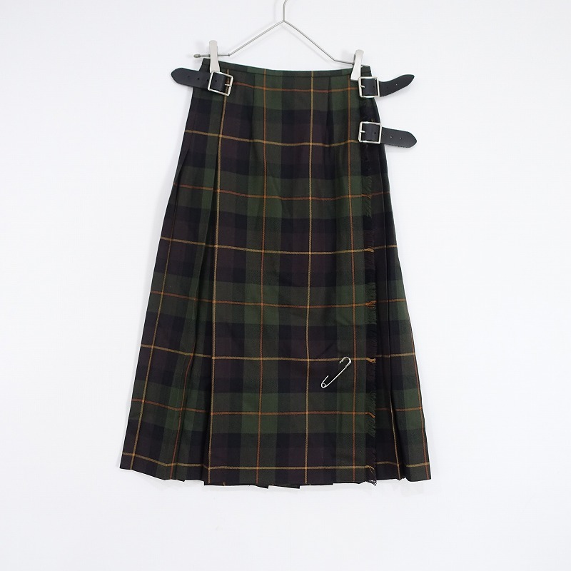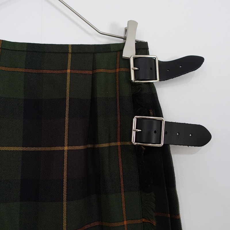 | O’NEIL OF DUBLINのウールチェックキルトスカートです。カラーはグリーン・ブラック・ブラウン・キャメル・ライトブラウンで、チェック織地で仕立てられております。両サイドのベルト留めのラップデザインで、サイズ調整可能になっております。サイドからバックにかけてプリーツ入りで、フロント縁はフリンジになっております。別途シルバーのピンが付属されております。 |