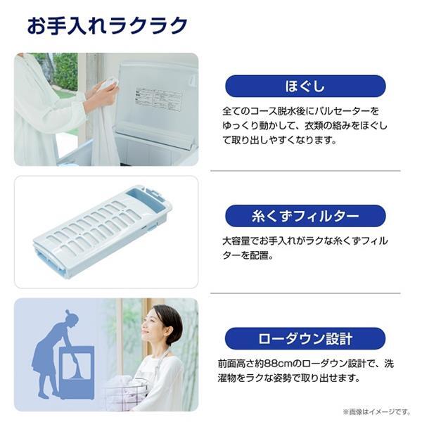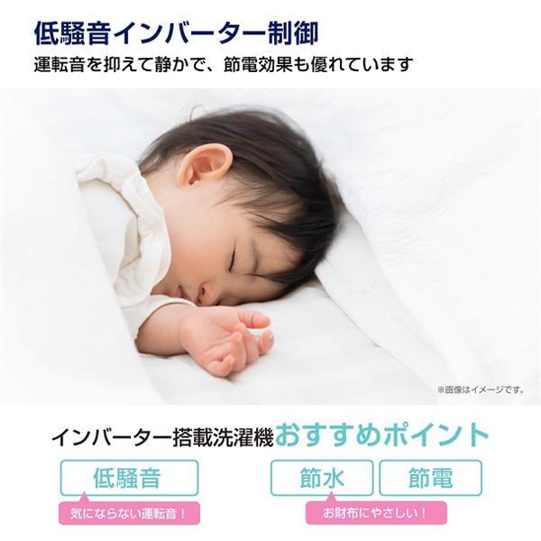 静かで省電力のインバーター機能や、スタイリッシュな天板のガラストップ、コンパクト&ローダウン設計、ほぐし脱水や大容量糸くずフィルターなど使い勝手の良い洗濯機です。