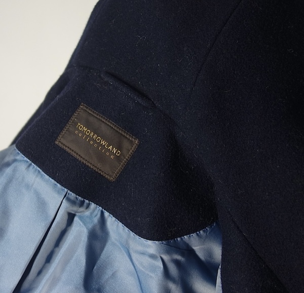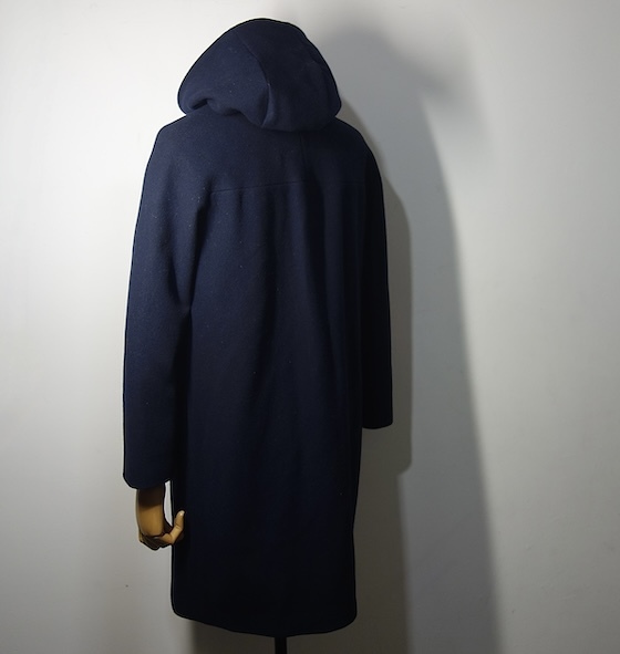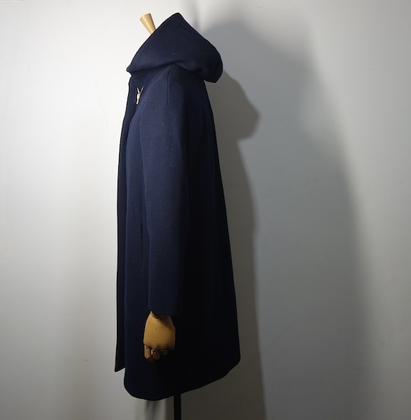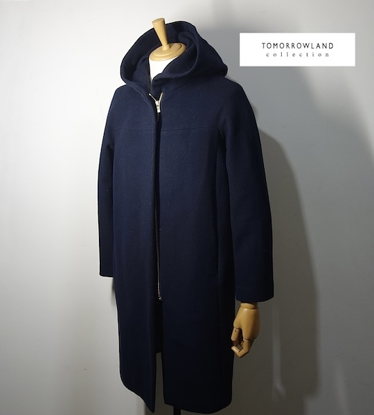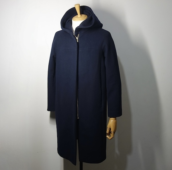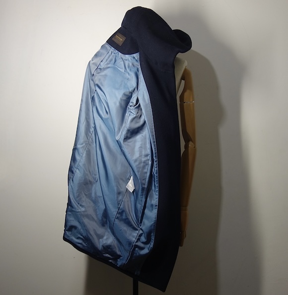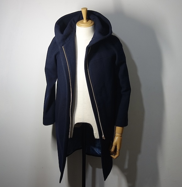 ダークネイビーにゴールドカラーのファスナーが映える洗練された上品な雰囲気の感じられるとても素敵なコートです。