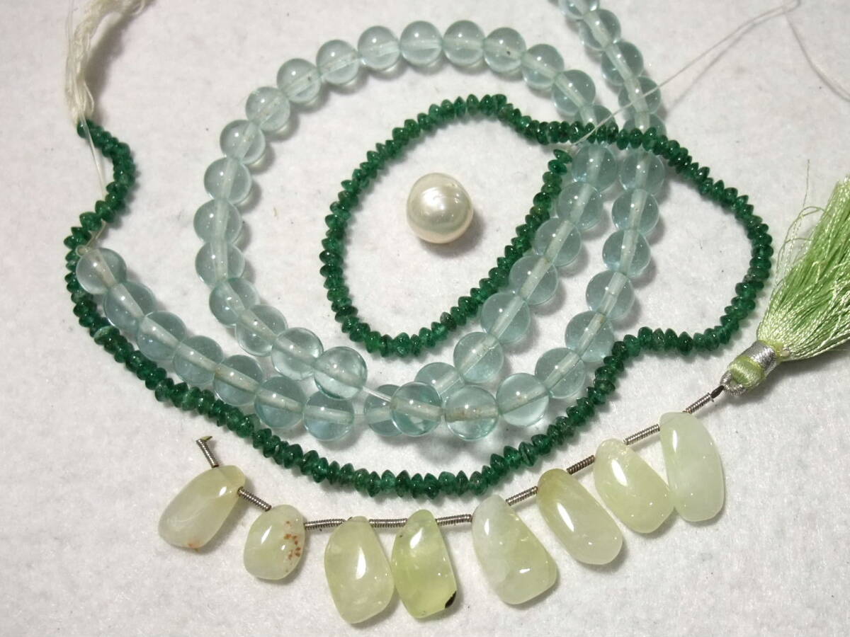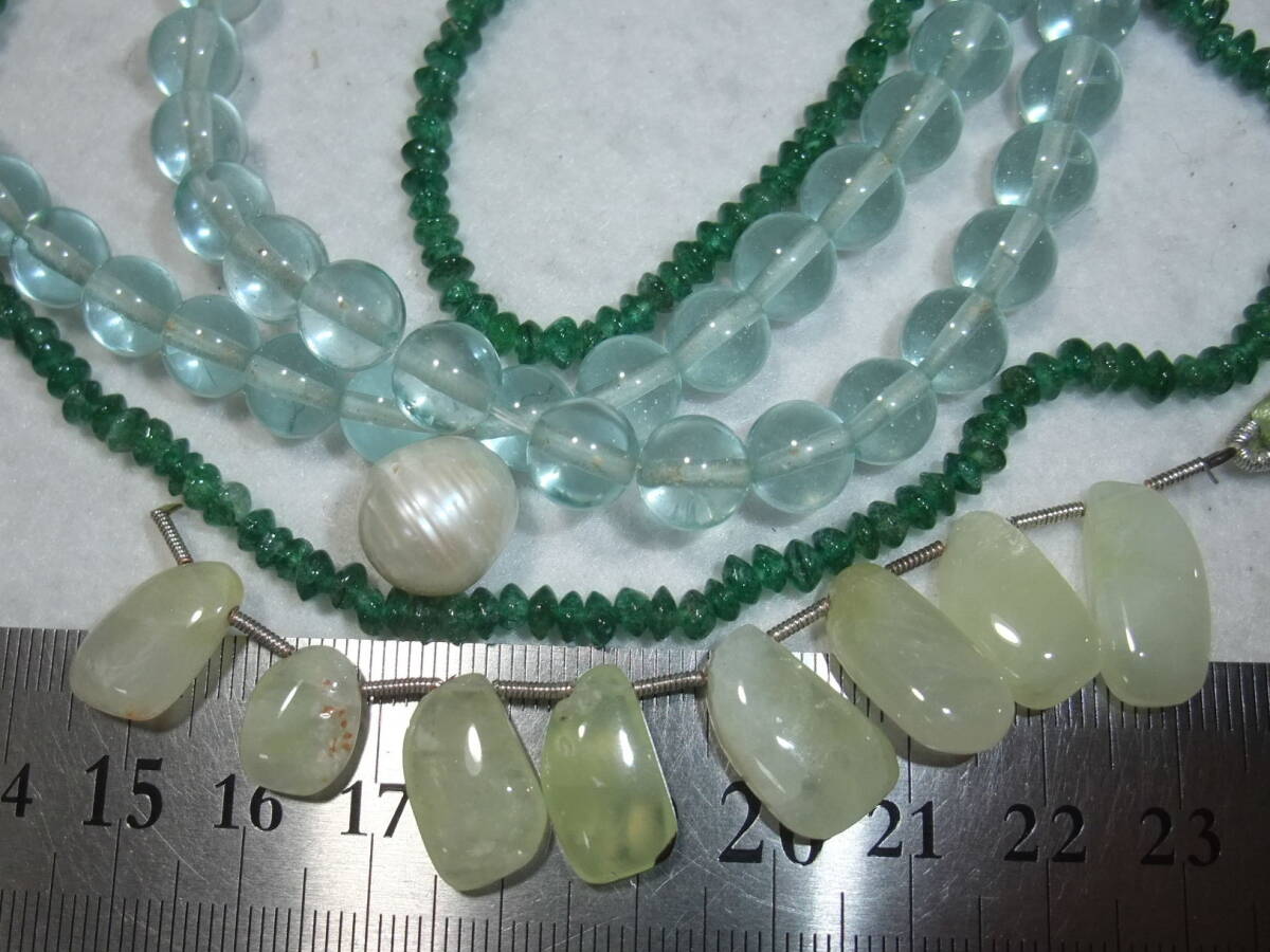 プレナイト葡萄石ラフスムースクレオルース&大粒淡水真珠パールや印度翡翠ビンテージグラスビーズ等 3 おまとめセット魔除け厄除け 125-4