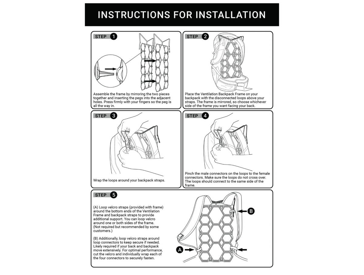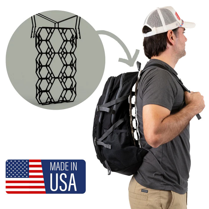 バックパックにこのフレームを取り付けることによって背中とバックパックの間に隙間ができ蒸れを減らし、また適度な柔軟性がありフレームレスのバックパックに剛性と持たせるとともに背中にフィットします。