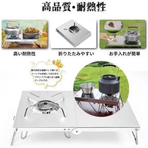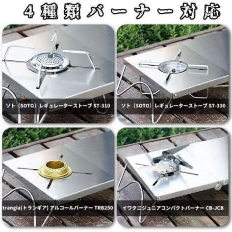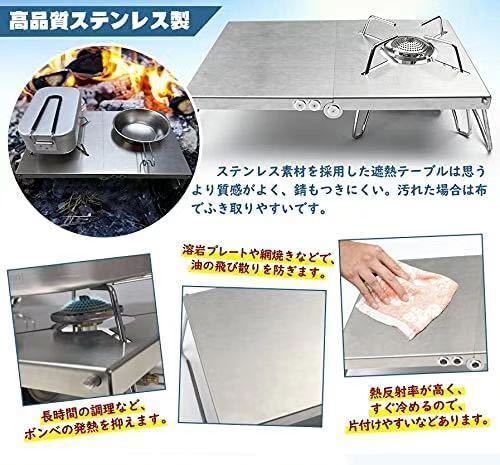【一台多役&四種類バーナー対応】:折りたたみ式テーブルと四種類バーナー兼用な遮熱板です。アウトドアの定番道具としてのSOTO st310バーナーの使用者のため、こちらの遮熱テーブルが誕生されました。しかも、SOTO st310だけではなく、SOTO st330、イワタニジュニアコンパクトバーナー、trangia(トランギア) アルコールバーナー及び同じ形のアルコールバーナーも取付できます。ステンレス製の遮熱板は遮熱性が高く、カセットボンベ上部のデッドスペースがミニテーブルとしてつかえます。しかもゴトクもきちんと安定させられます、クッキングしながら、お皿やカップなどは置くことができます。