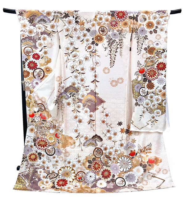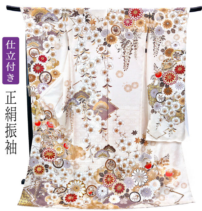 桜、菊、松、紅葉など季節のモチーフが一面に描かれた美しい振袖です。