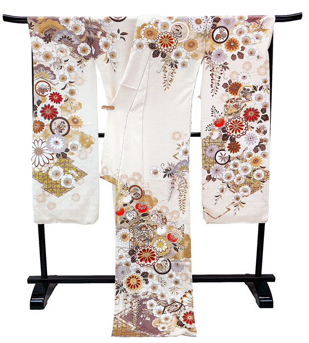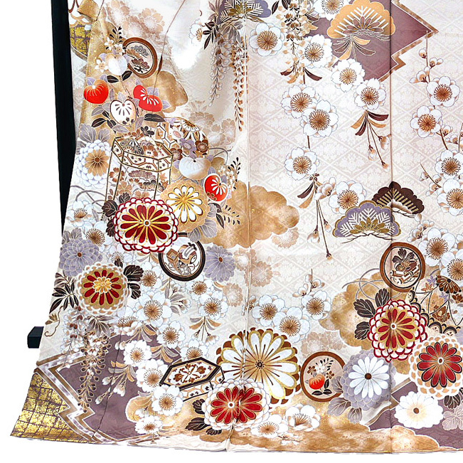 前身頃のメインのお柄には貝桶と菊が描かれ、貝桶柄には金彩、花柄には手刺繍による金こま刺繍が施されております。