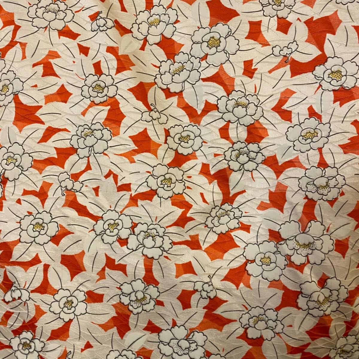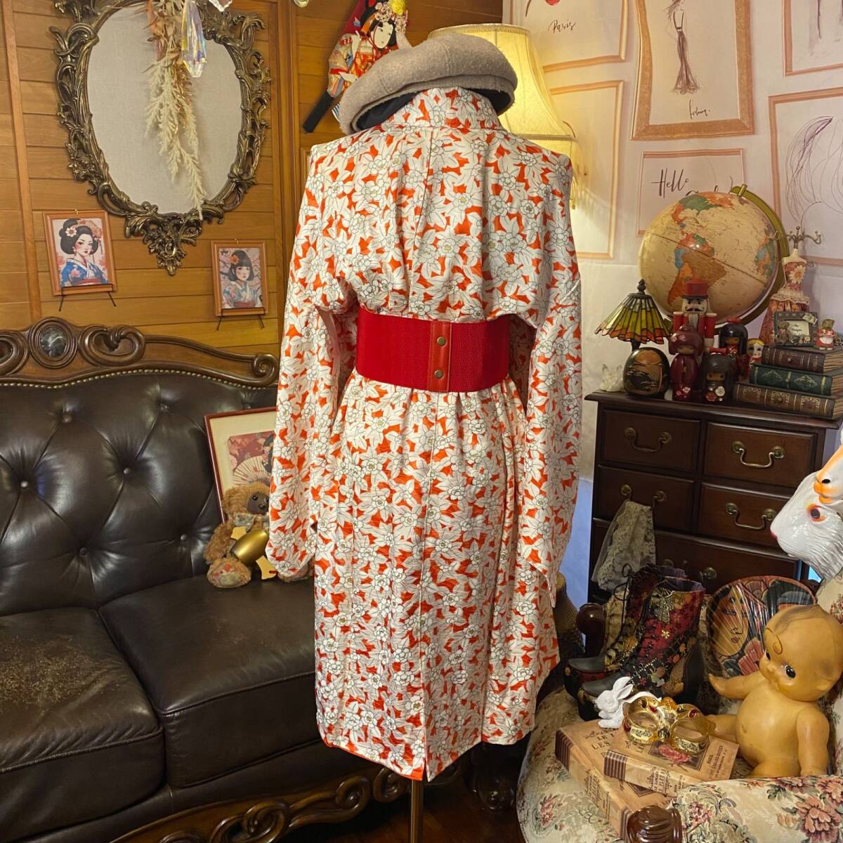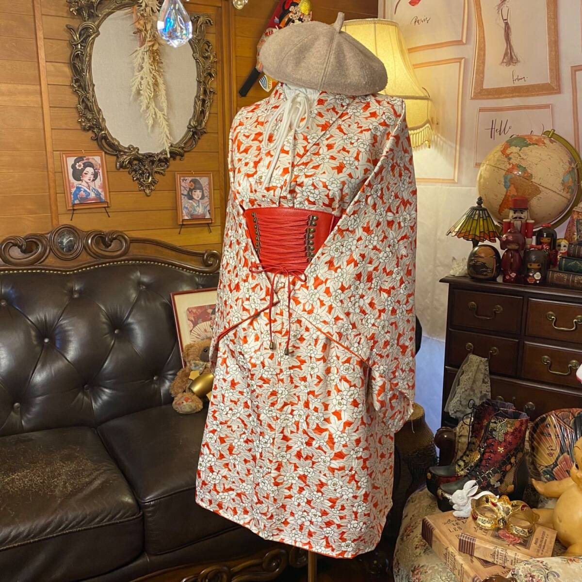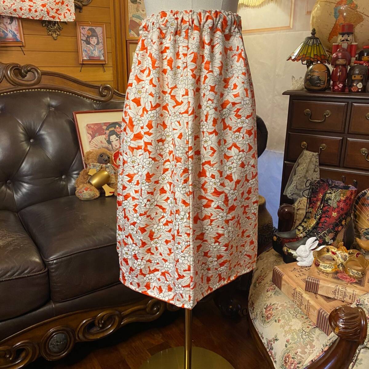 【 着物リメイクセットアップ ツーピース 2部式 レトロ 古着 和洋折衷 ハンドメイド 洗える 化繊 鮮やかな朱色に彩られた背景に白い花々が咲き誇る和柄 S-122】