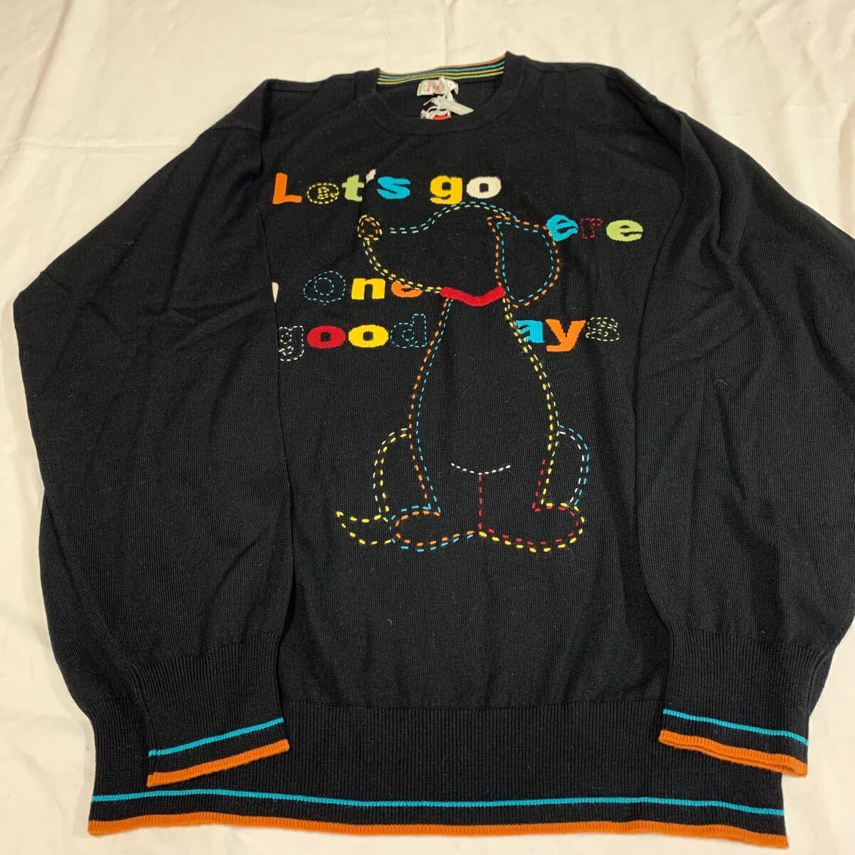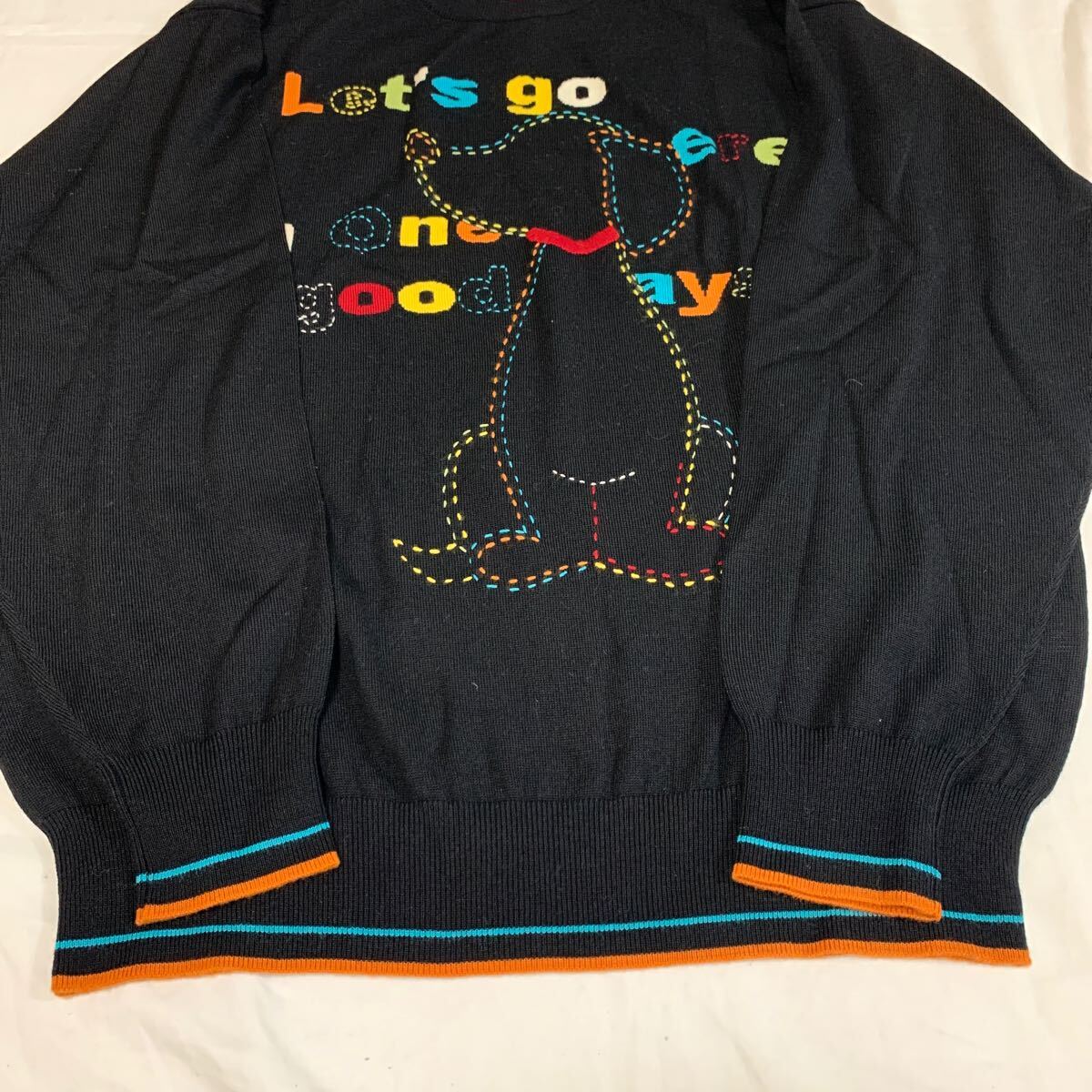 カラフルな犬のデザインが特徴の黒いニットセーター。