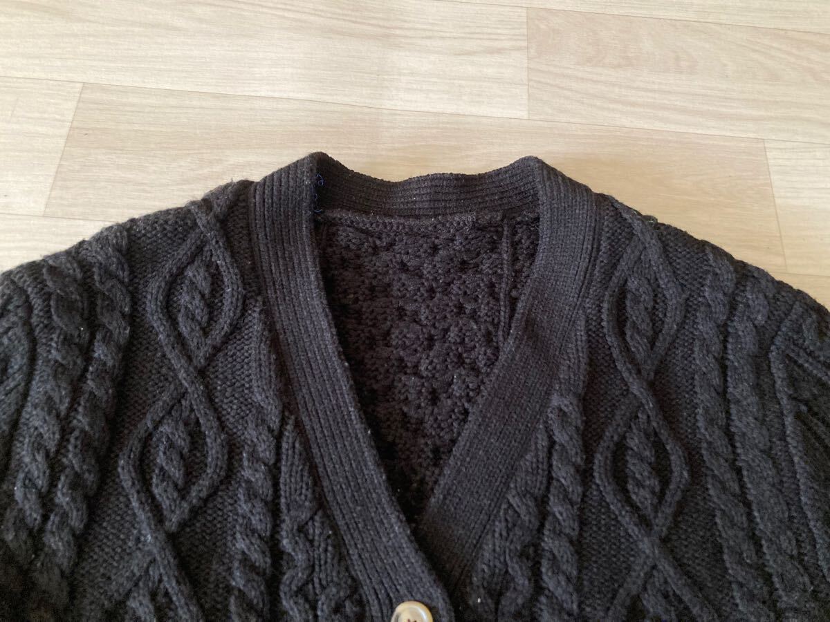 アジオネ ケーブルニットデザインのブラックカーディガン、Vネックと5つのボタン付き。