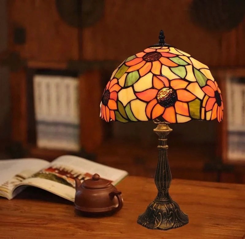 芸術品★ステンドランプ ステンドグラス アンティーク ヒマワリ花柄レトロな雰囲気がおしゃれ ティファニー銅製デスクライト照明