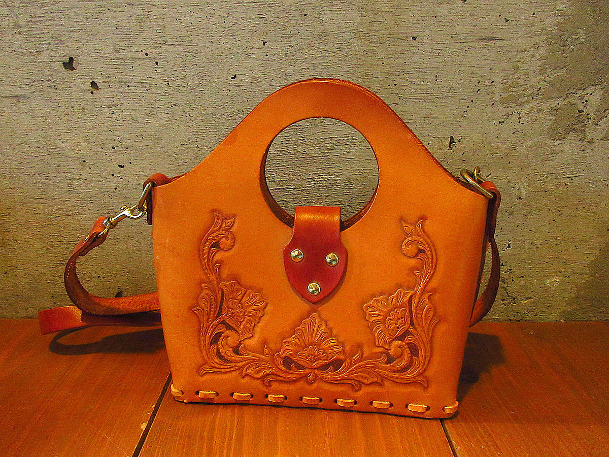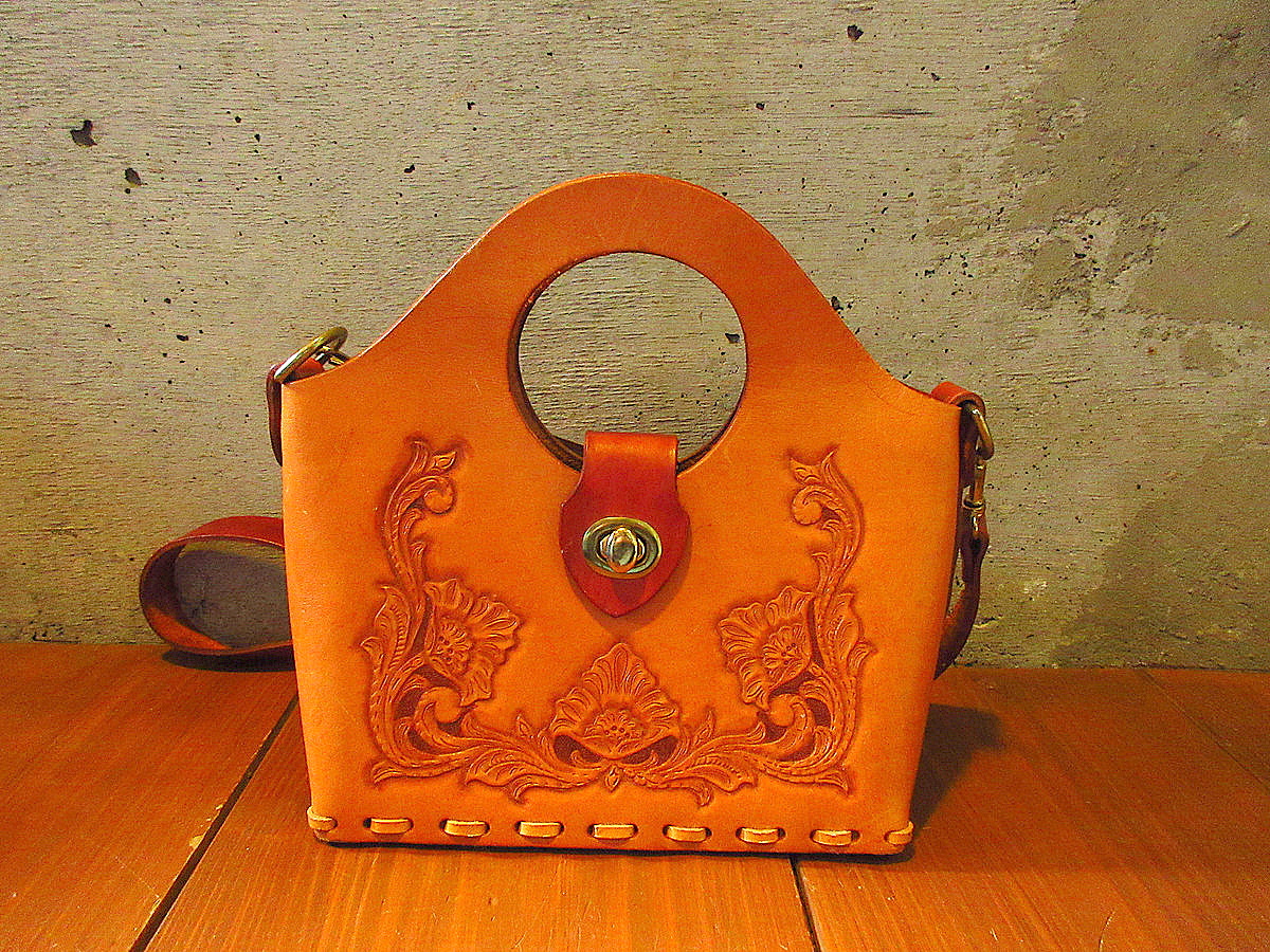 ビンテージ60’s70’s●型押しレザーショルダーバッグ茶●250117k4-bag-shd 1960s1970sレトロかばんフラワー