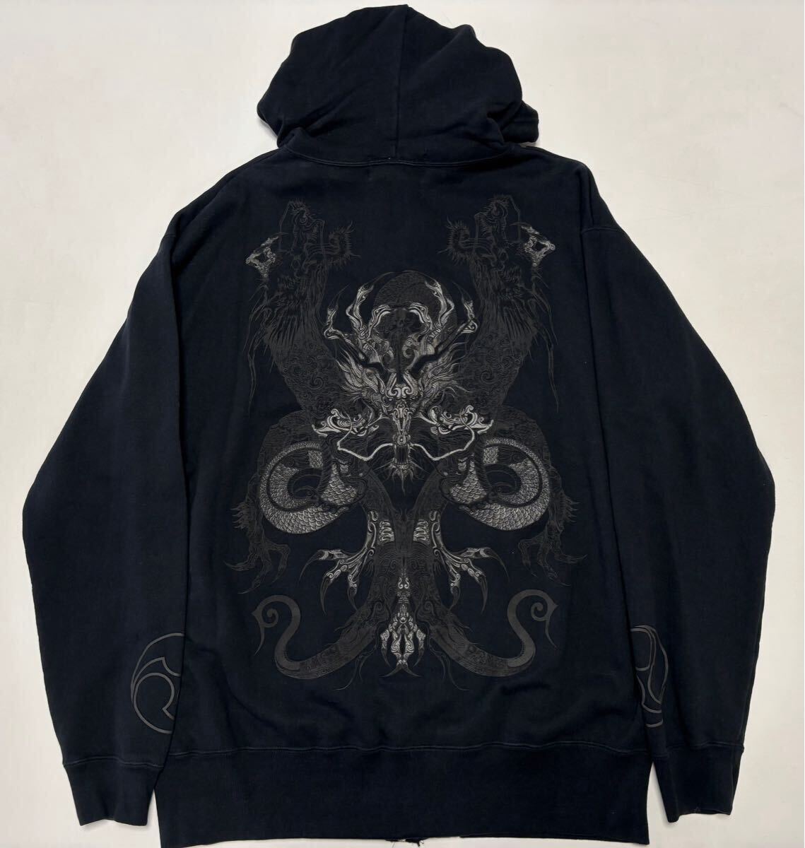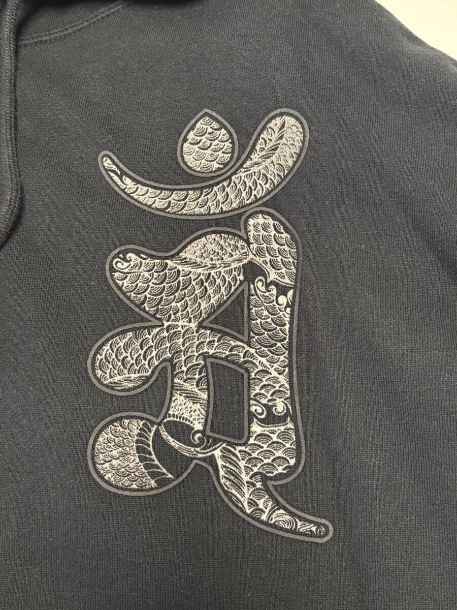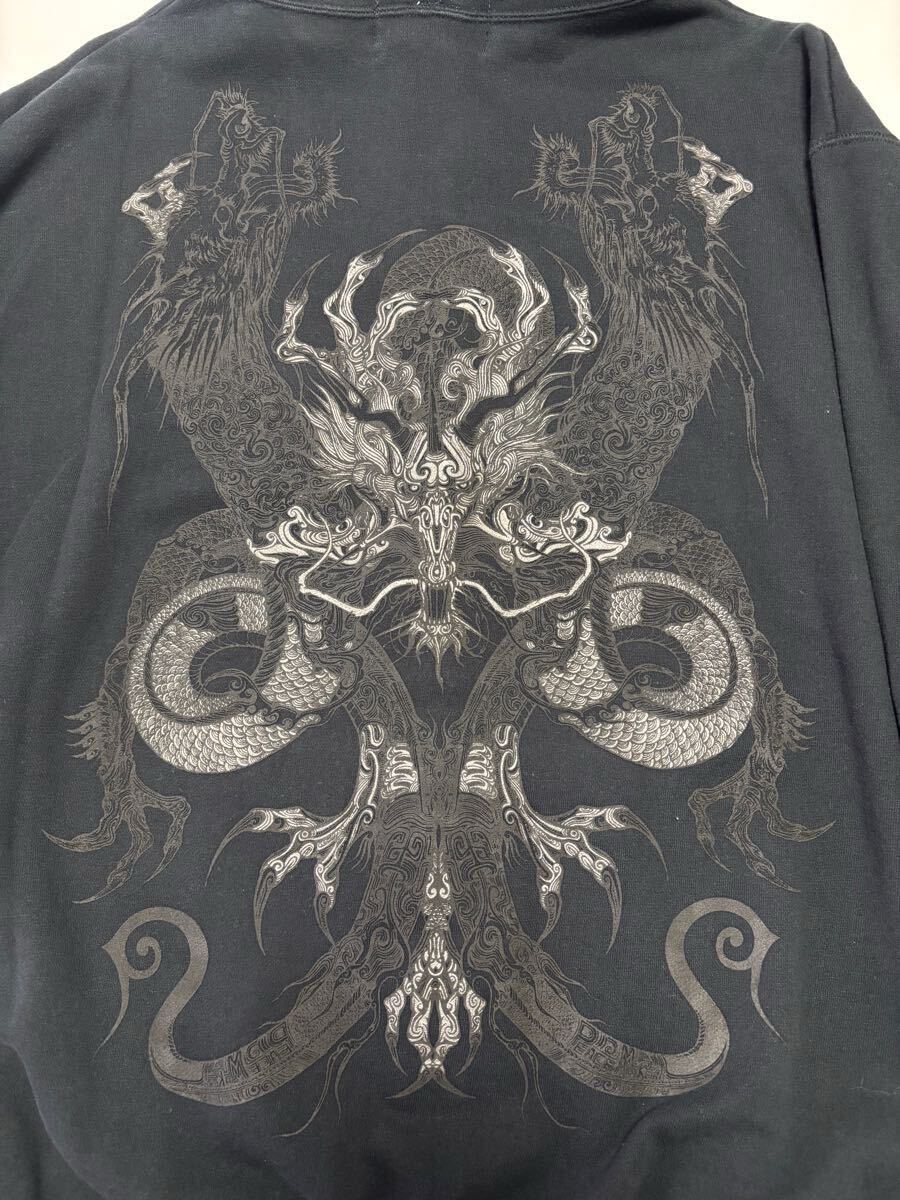 前面に龍の鱗をバックにした梵字のようなデザインが入っていて、後面に龍のイラストが大きく描かれています。