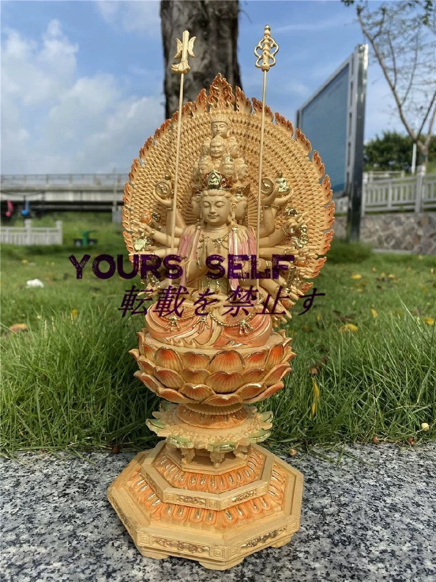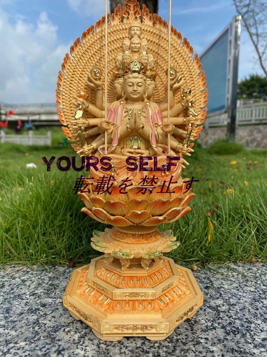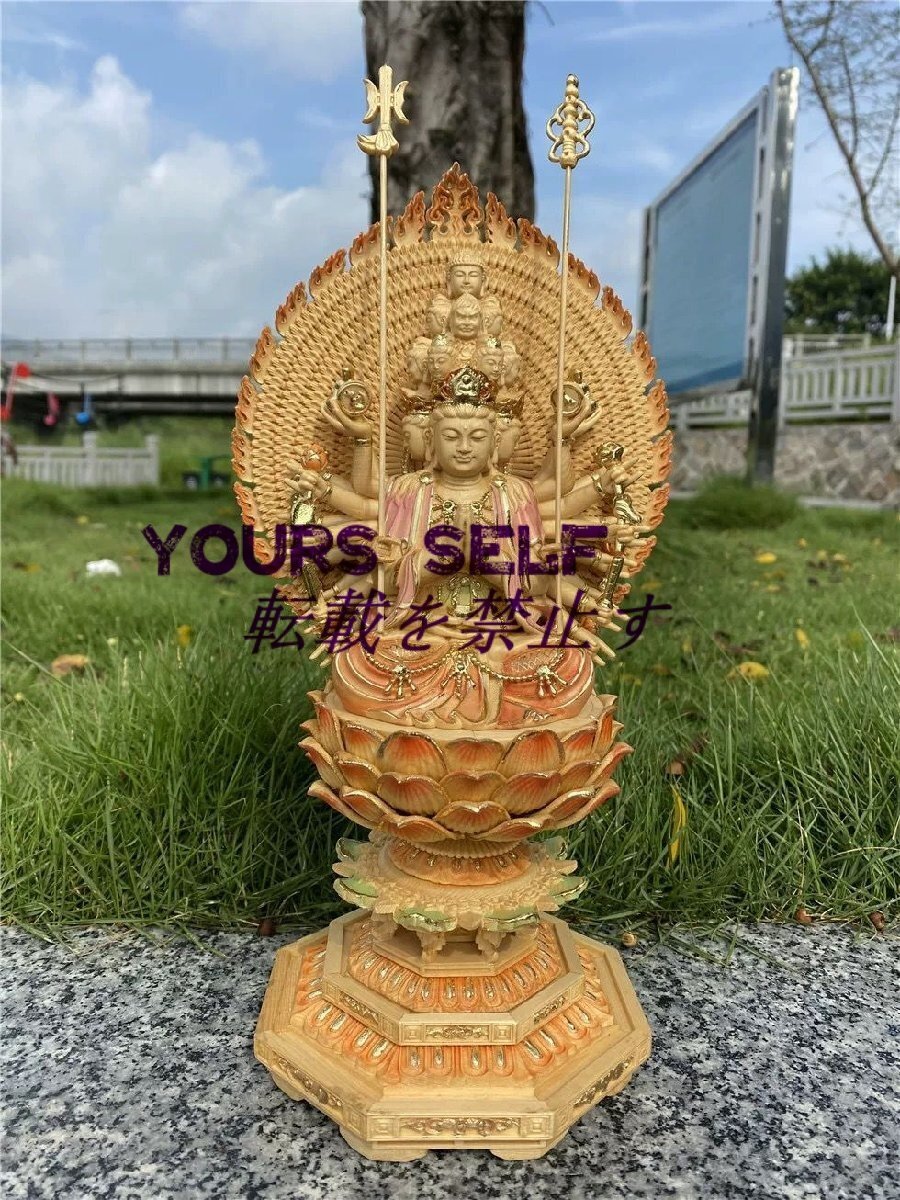 千手観音菩薩 座像 観音菩薩 仏壇仏像 木彫り 置物 専属千手光背 子年 守り本尊 祈る 厄除け 桧木彩色 木彫り仏像 総高約31cm