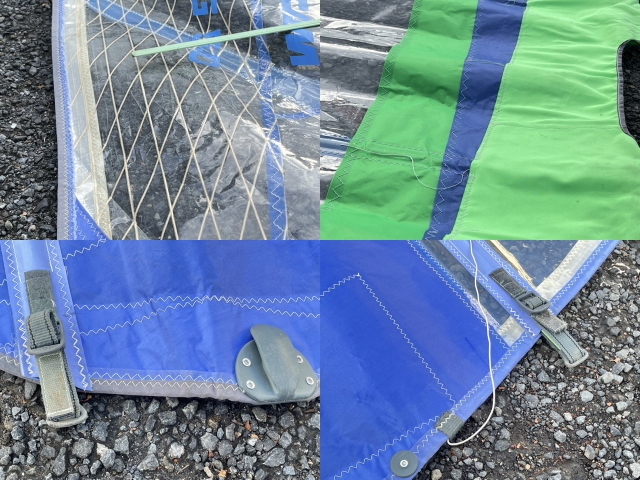 ケースシミ汚れがサイドに目立ち、全体に色褪せがあります。帆全体に若干の色褪せがみられ、薄緑あたりの軸などは汚れシミが下を中心に全体にあります。
