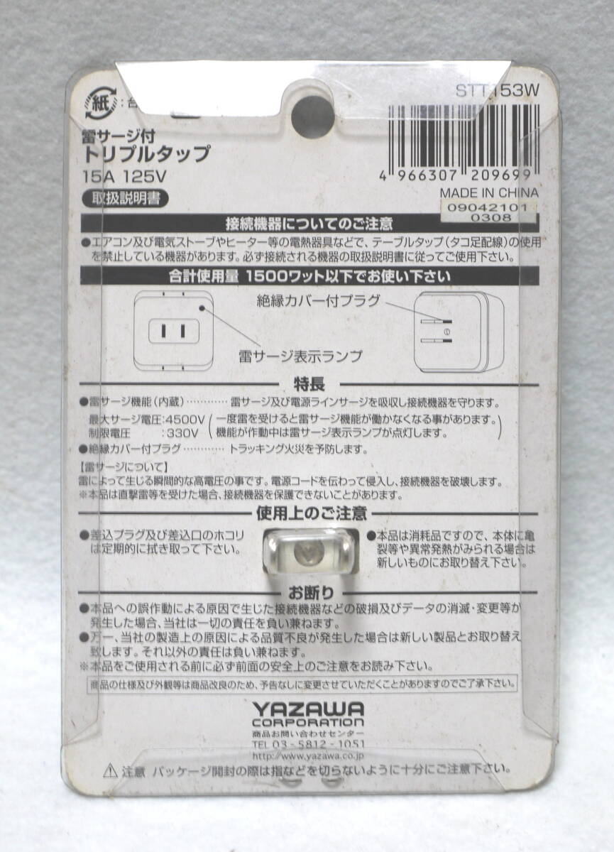 ヤザワ 雷サージ付トリプルタップ 3個口/トラッキング火災予防カバー付 STT153Wの出品です