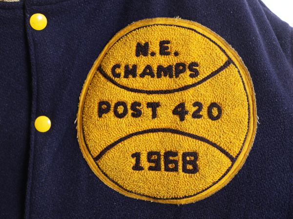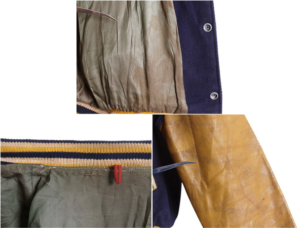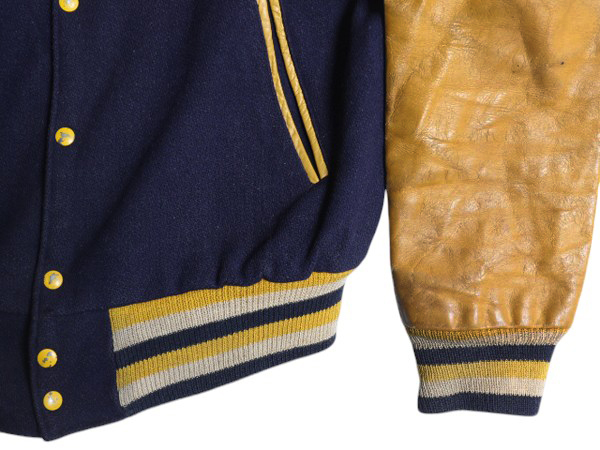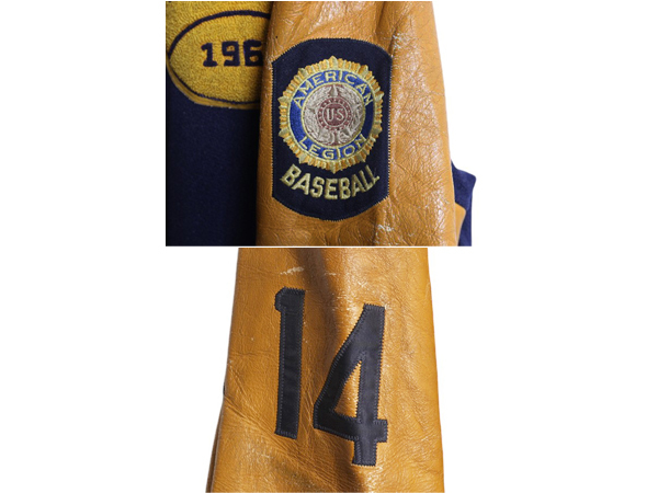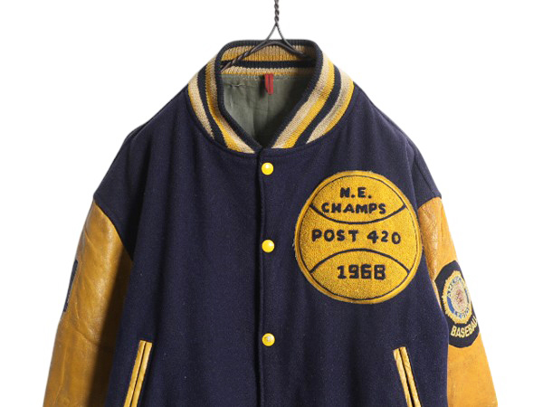 Hatchers の ウールスタジャンです。 高品質なスタジャンで見かける事の多い Hatchers製 ヴィンテージ 古着好きにはお馴染みかと思います。 1924年創業、スプリングフィールドの 老舗スポーツ店 FENTON'S のショップタグ付き MADE IN USA (アメリカ製 表記無し) 素材表記はありませんが、 しっかりとしたヘビー( メルトン )ウール 保温性の高い、現行とはまったく違う ヴィンテージ独特の目の詰まった上質な素材が使用されています。 袖は、柔らかい本革レザーの切替 内側は、肌触りの良い洒落た玉虫色のライナー付き フロントは、スナップボタン開閉 両サイドにハンドウォーマーポケット 左袖に American Legion ( アメリカ在郷軍人会 ) の エンブレム刺繍、右袖にナンバリング 左胸に ベースボール の豪華なサガラワッペン入り 合わせやすいネイビーに、袖はイエローの切替 首、袖、裾、リブのラインが良いアクセントになった ヴィンテージのグッドデザイン これだけで様になる 非常にかっこいい商品です。 |