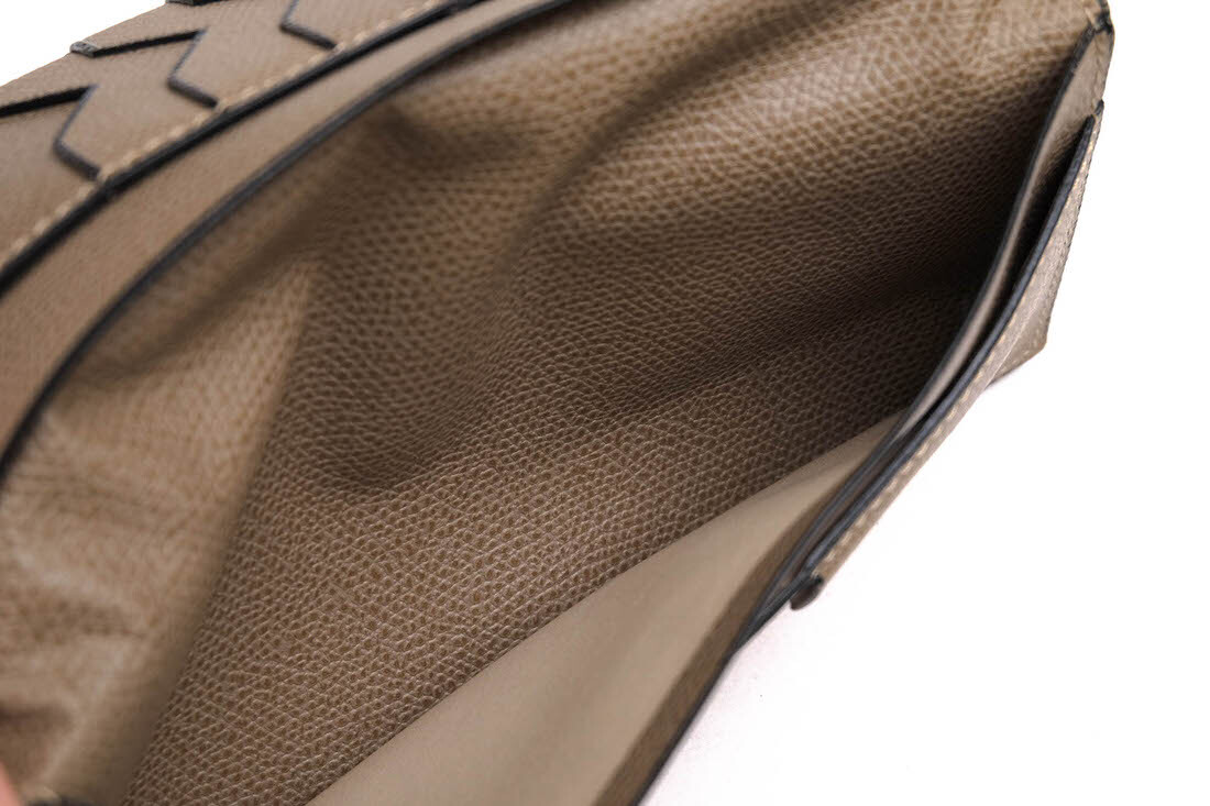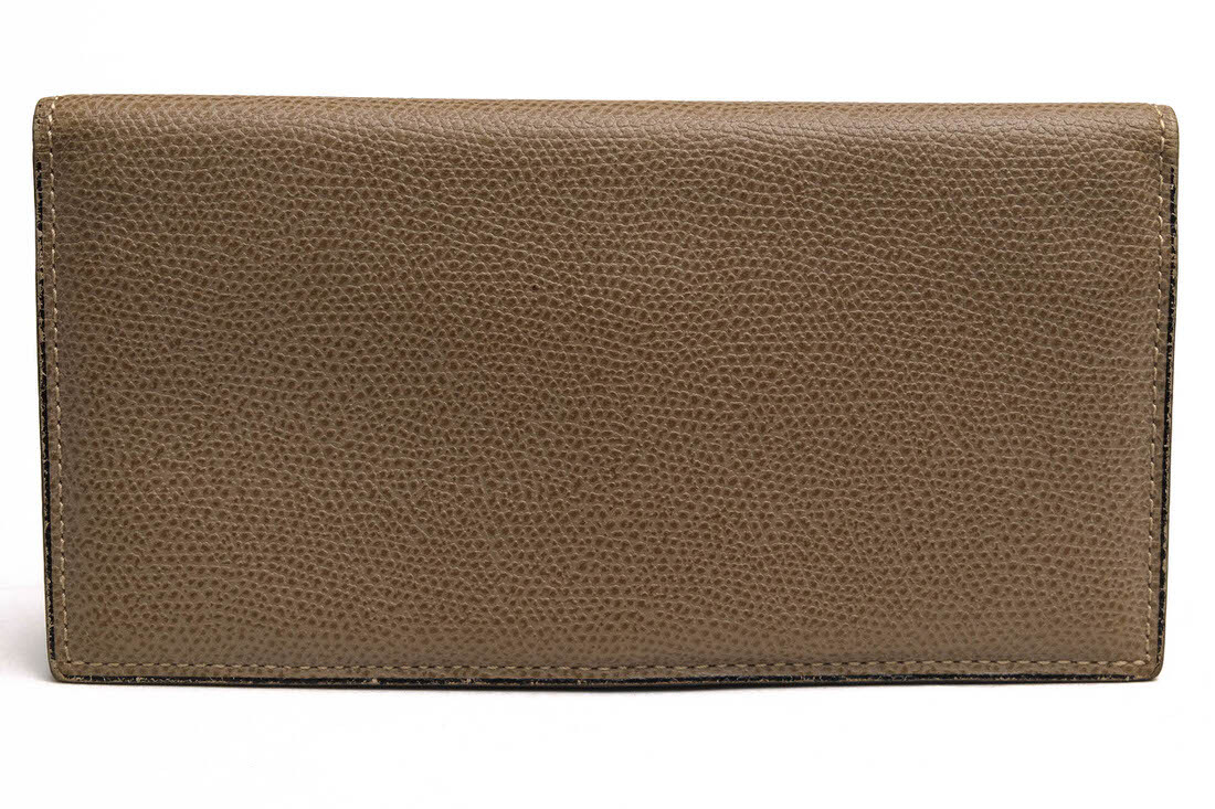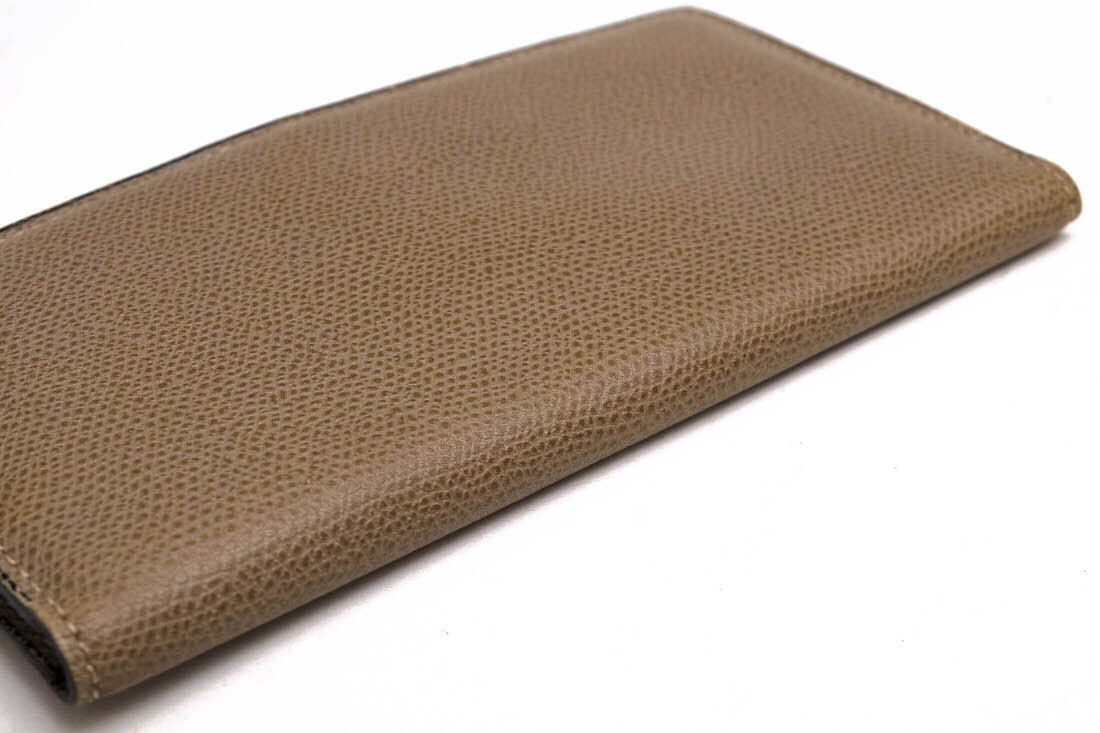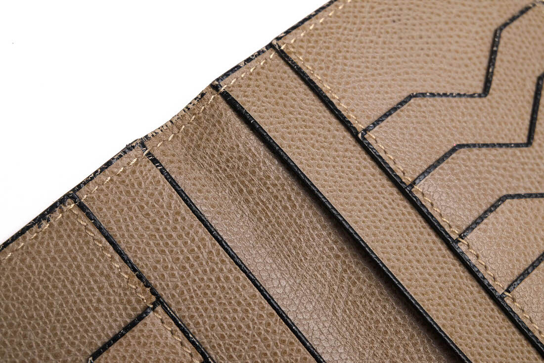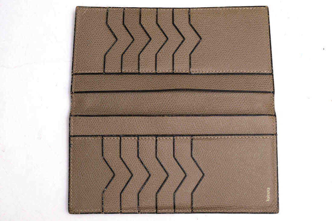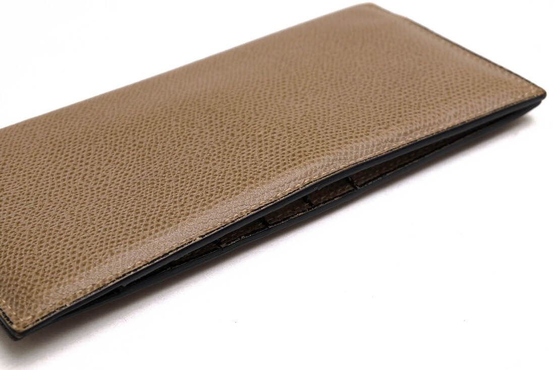 | ブランドの象徴であるV字カットが施された12枚用のカードスロット付き縦型の長財布です。小銭入れなどのかさばるポケットを取り除いたシンプルな装い。ライナーは革張り仕様です。コバと呼ばれる革をカットした端の部分にヴァレクストラ独自の染料"Costa"を手作業で何層にも塗り重ねて磨き上げました。 |