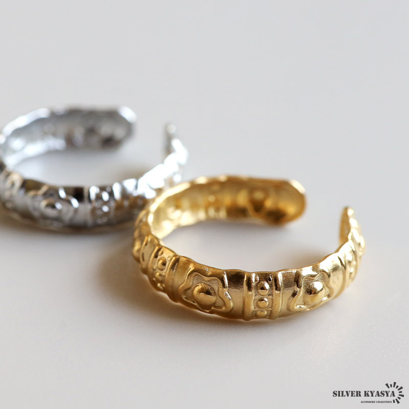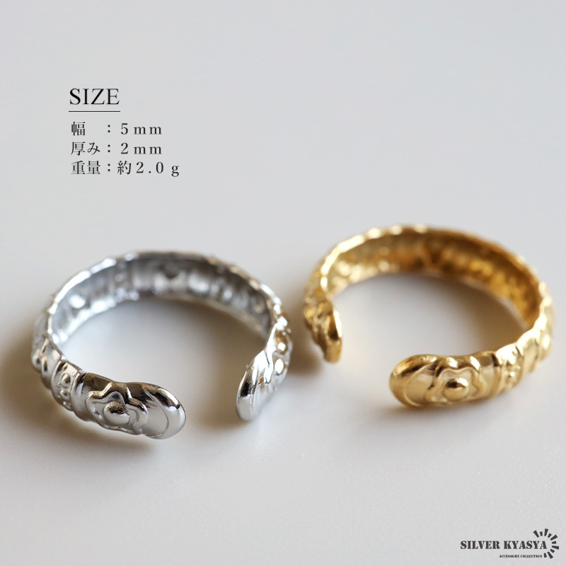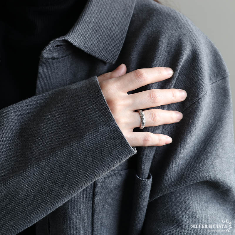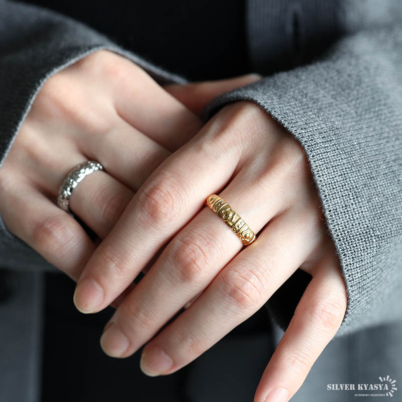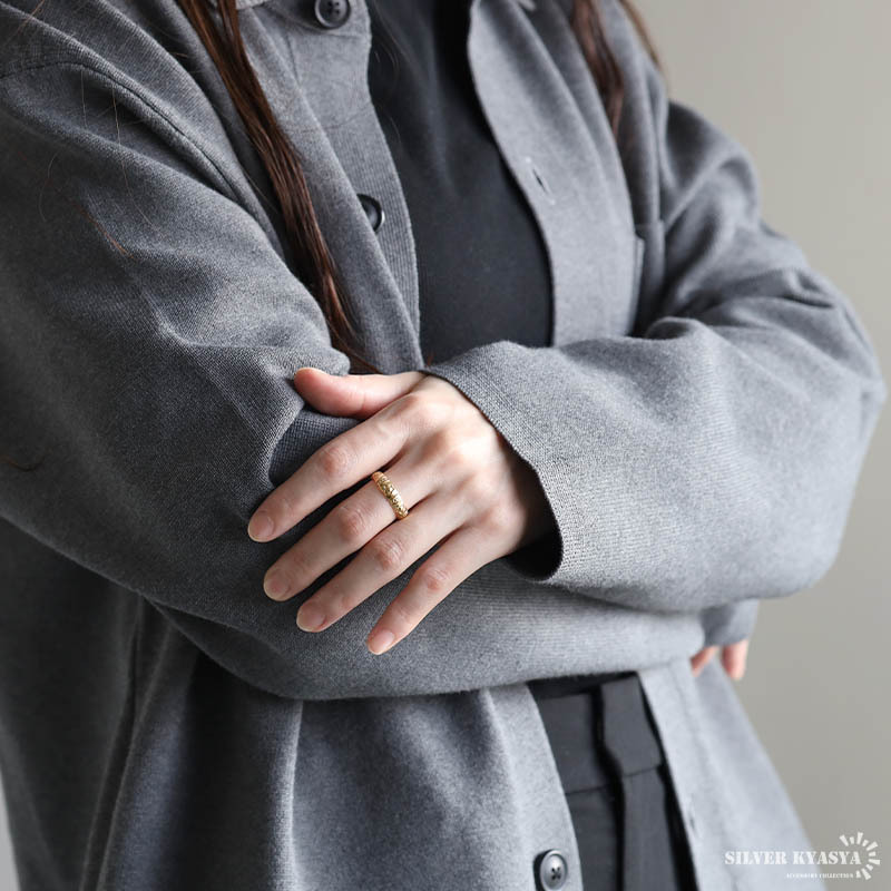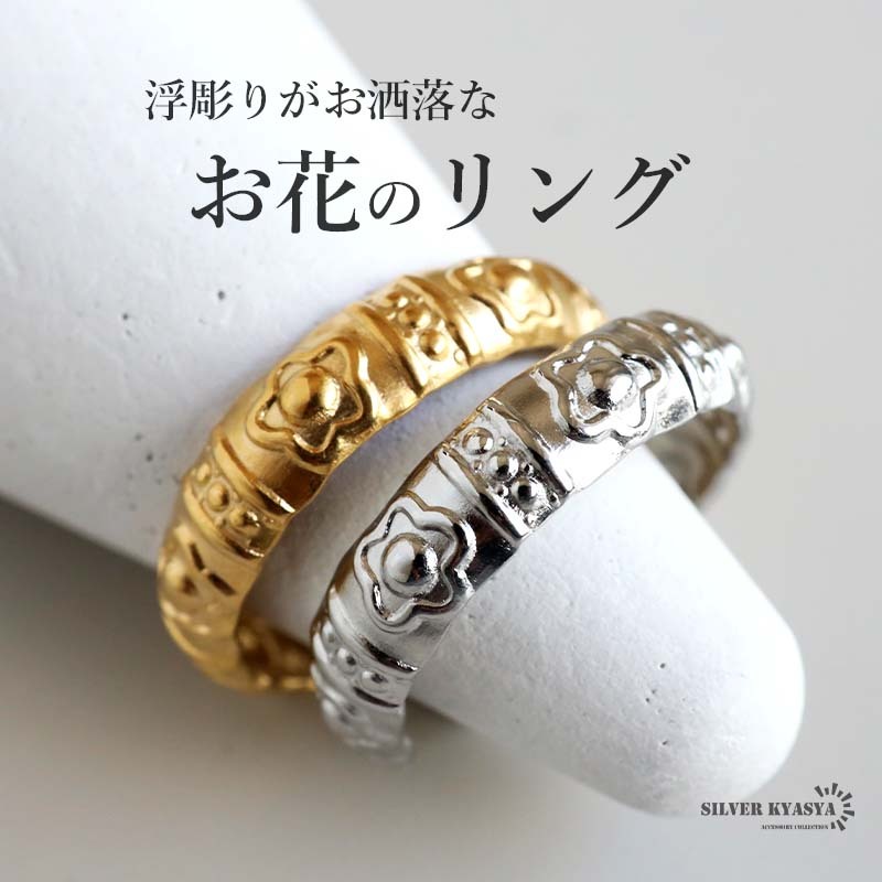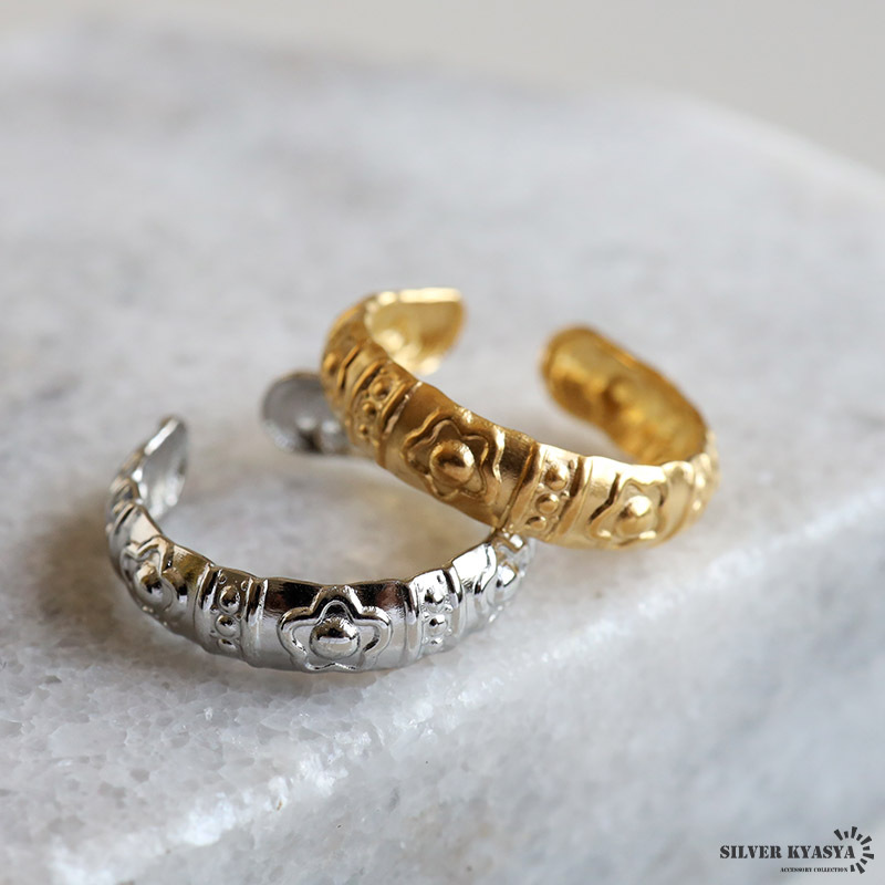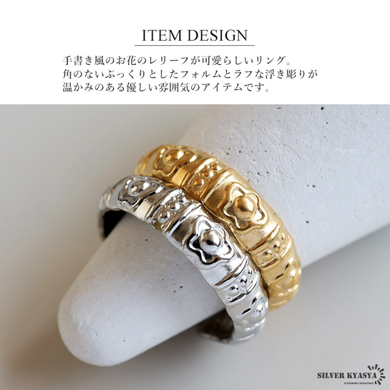 手書き風のお花のレリーフが可愛らしいリング。角のないぷっくりとしたフォルムとラフな浮き彫りが温かみのある優しい雰囲気のアイテムです。