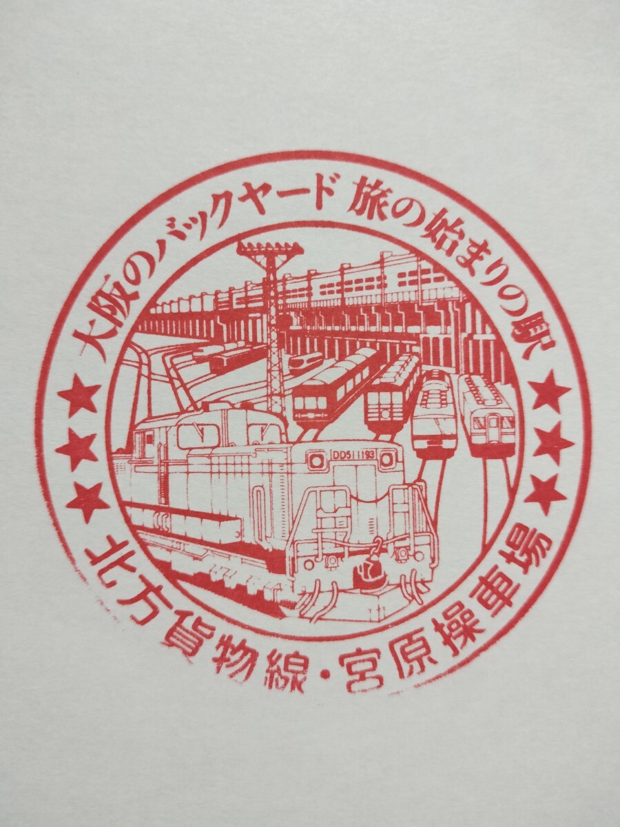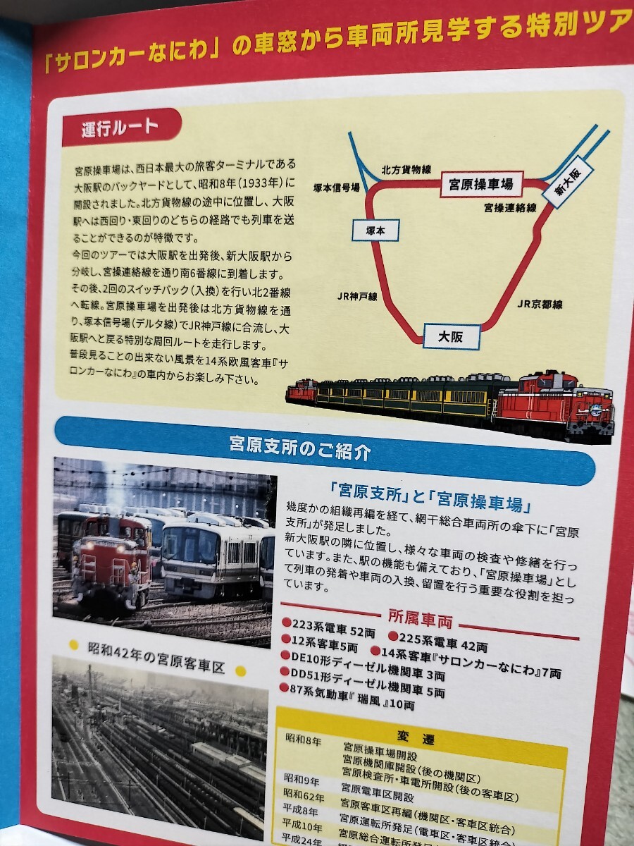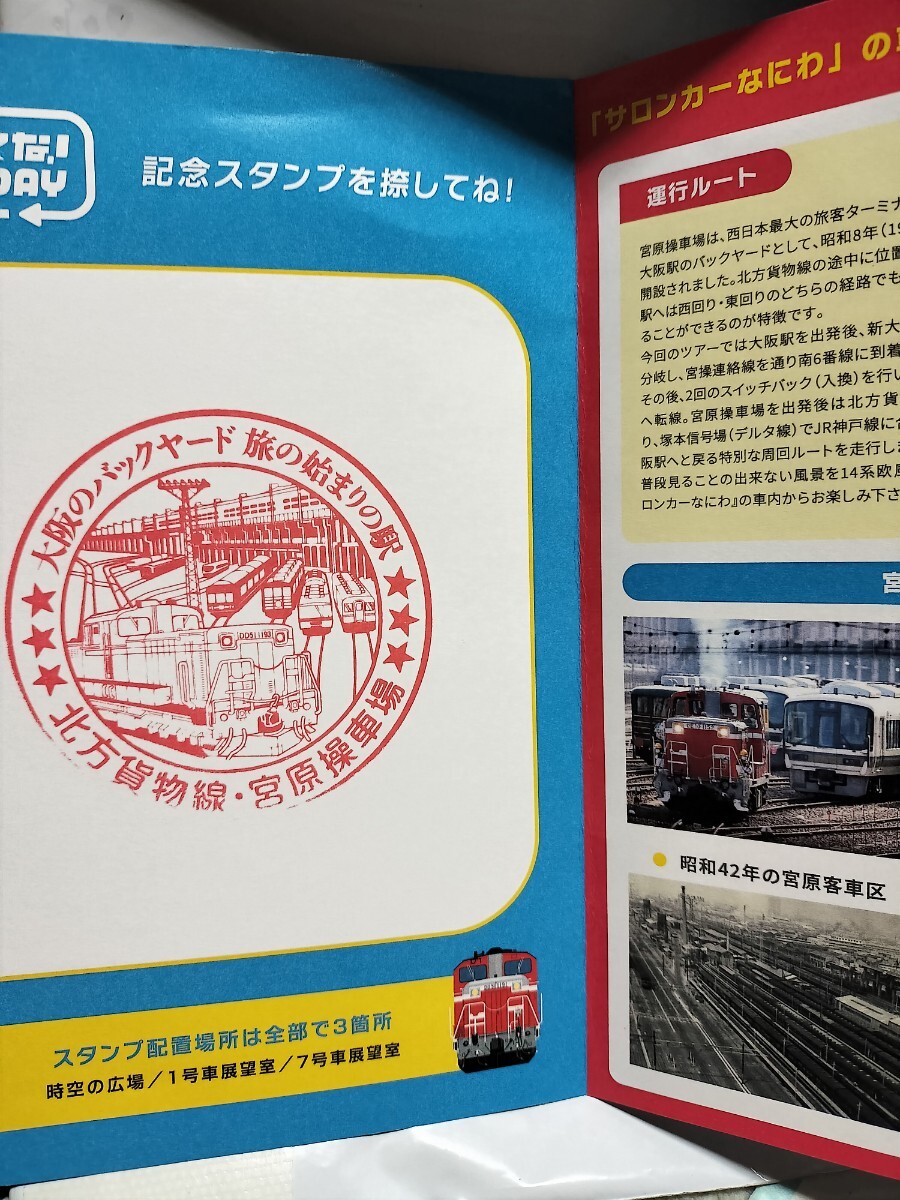 「サロンカーなにわ」による団体臨時列車が、大阪~網干総合車両所宮原支所間で運転の際の限定の駅スタンプ、パンフレット。