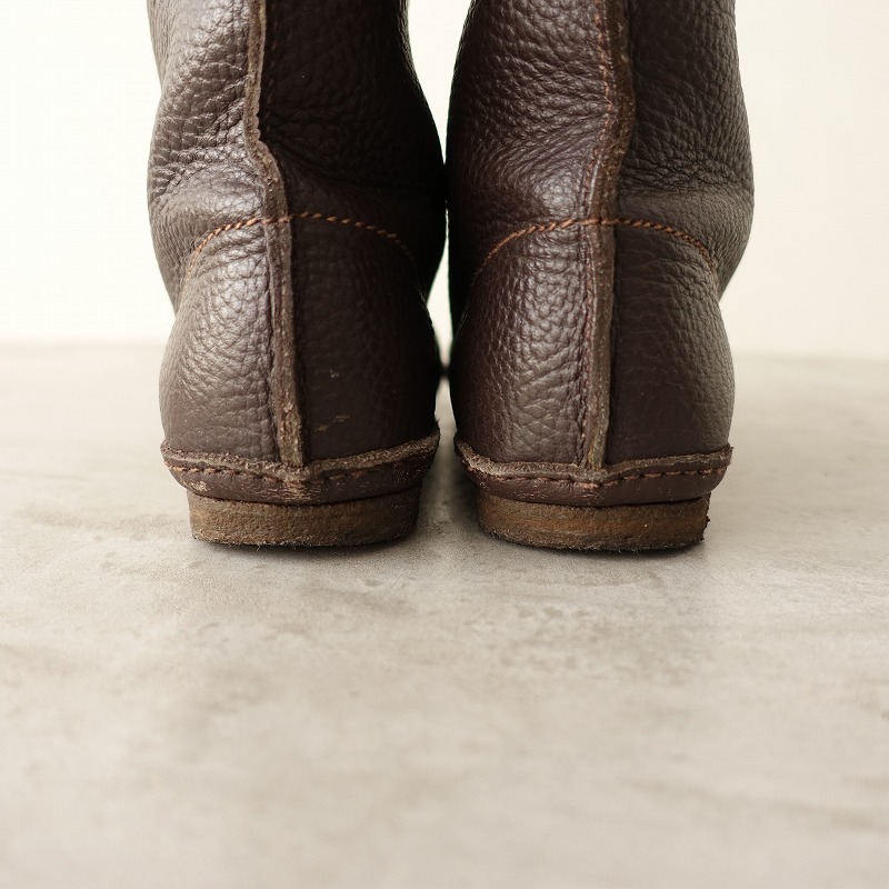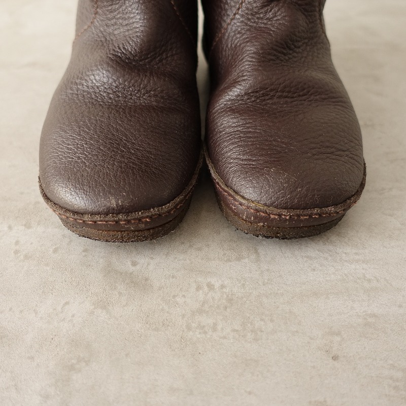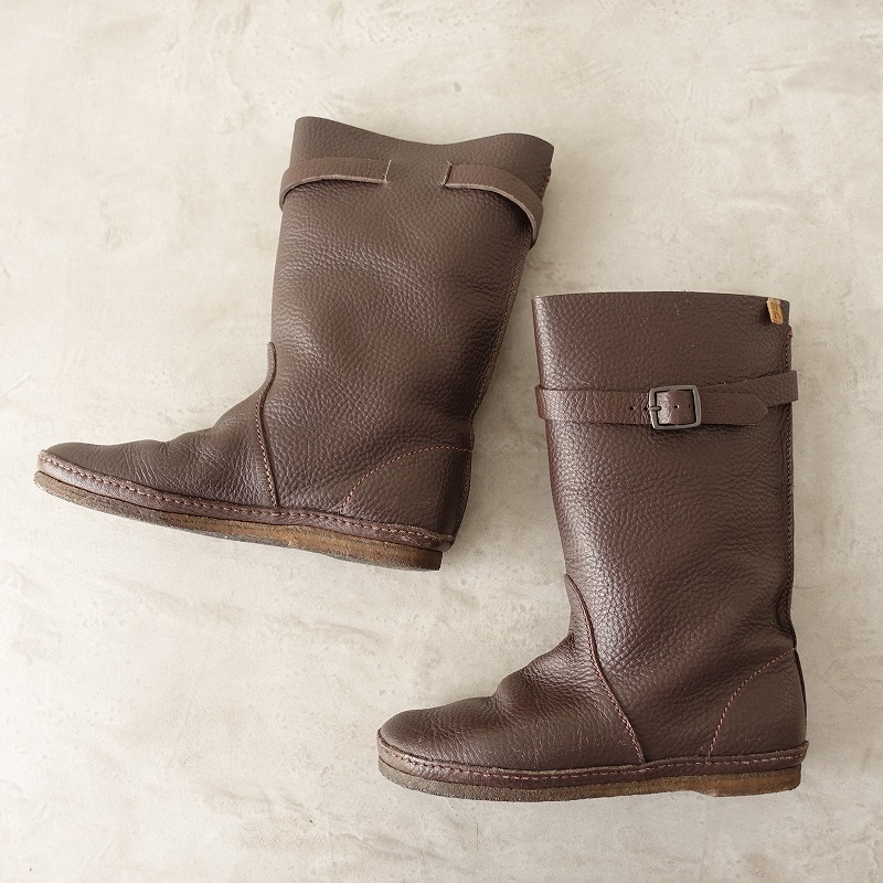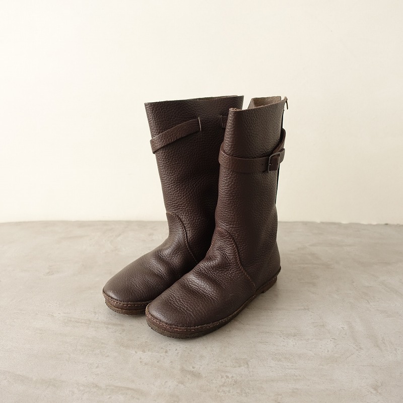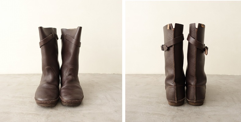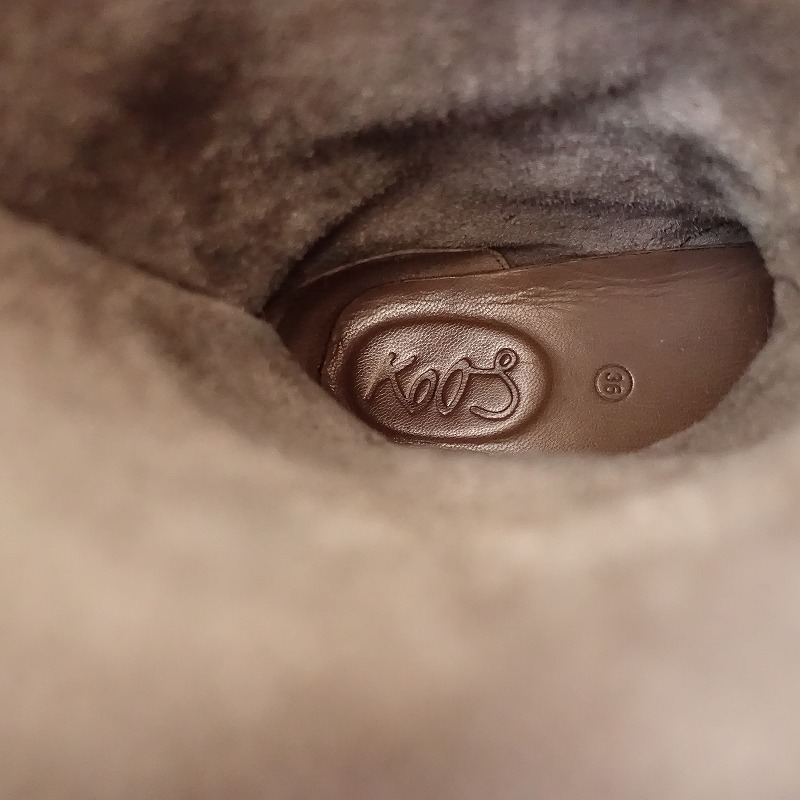 KOOSのレザーミドルブーツです。カラーはダークブラウンで素材はレザー、履き口周りに5段階に調節可能なベルトがあしらわれたデザインです。 |