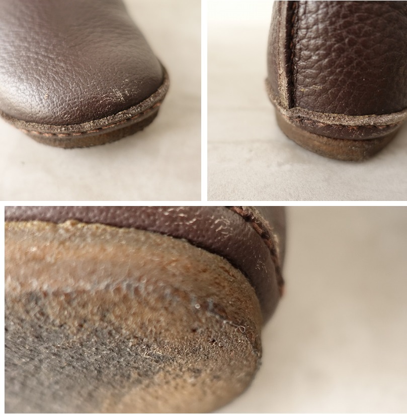 ユーズドで靴底に汚れ、かかとソールに少し減り、右足つま先や左足かかとなど所々に少し擦れキズが見受けられます。レザー製品ですので、使用頻度に関わらず付いたキズなどがあるかと思われます。ご理解頂ける方のご購入をお待ちしております。箱や保存袋がある場合はお付けしますが、汚れや破損等がある場合がございます。ご了承の上ご購入下さいませ。 |