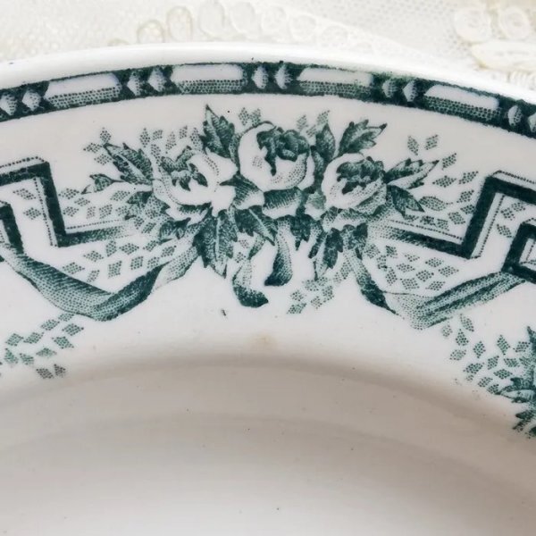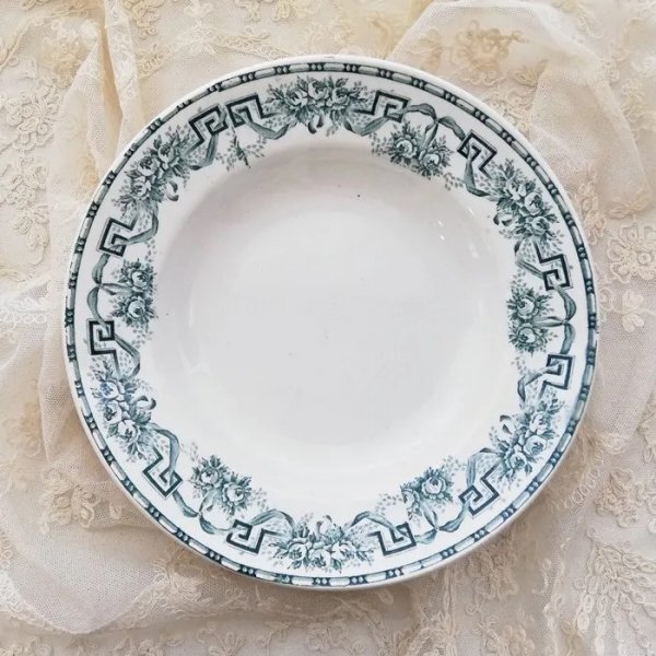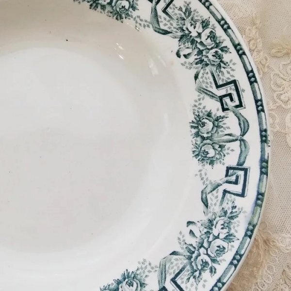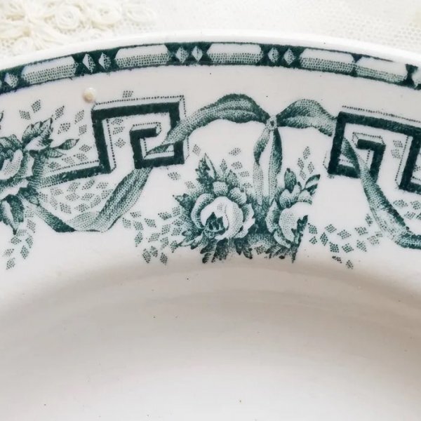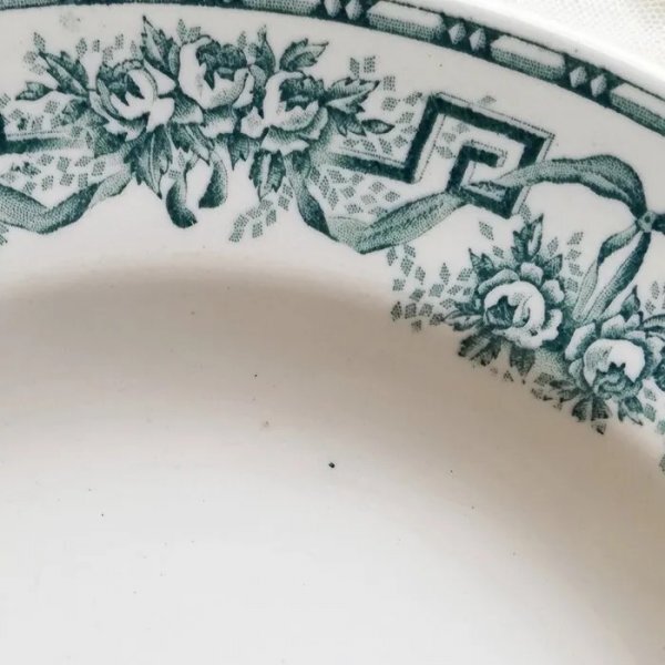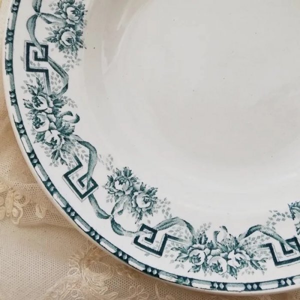 アンティークプレートには、シミ・カトラリーキズ・ヘアライン・練ムラ・貫入・ブラックスポット・ペイントロス・製造時にできる凹凸などや、釉薬がかかっていない箇所がある場合がございます。