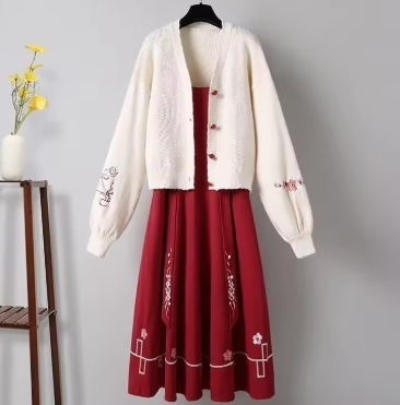 女性のための刺繍された花柄のセーター,ドレス,特大の中国の衣装,特大の伝統的な服 Sweater Sling Set サイズ: XXXL