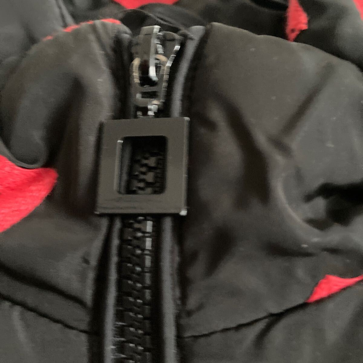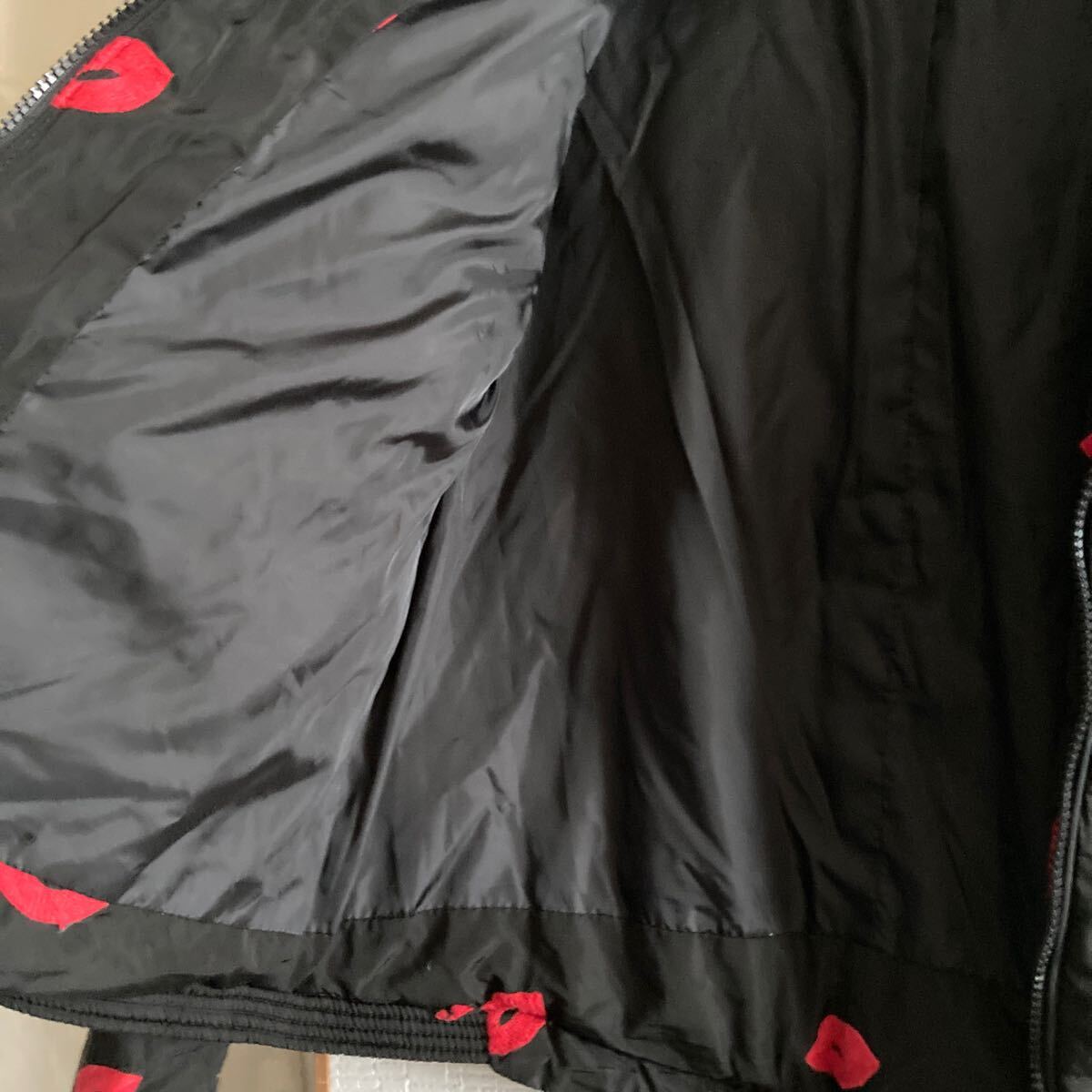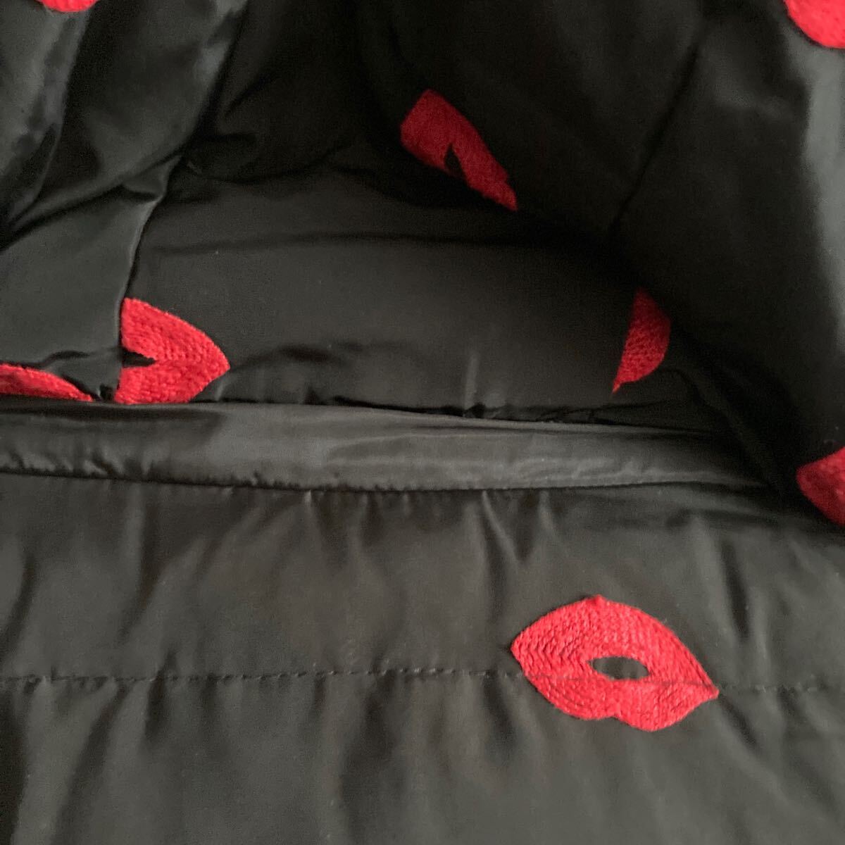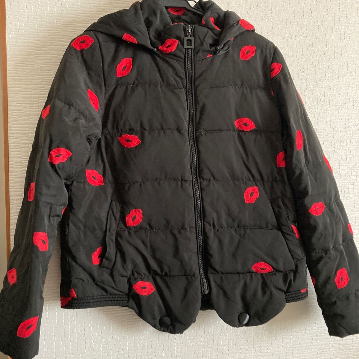 リップ柄の刺繍が散りばめられていて大変かわいいダウンジャケットです。フードは取り外し可能です。タグなし。