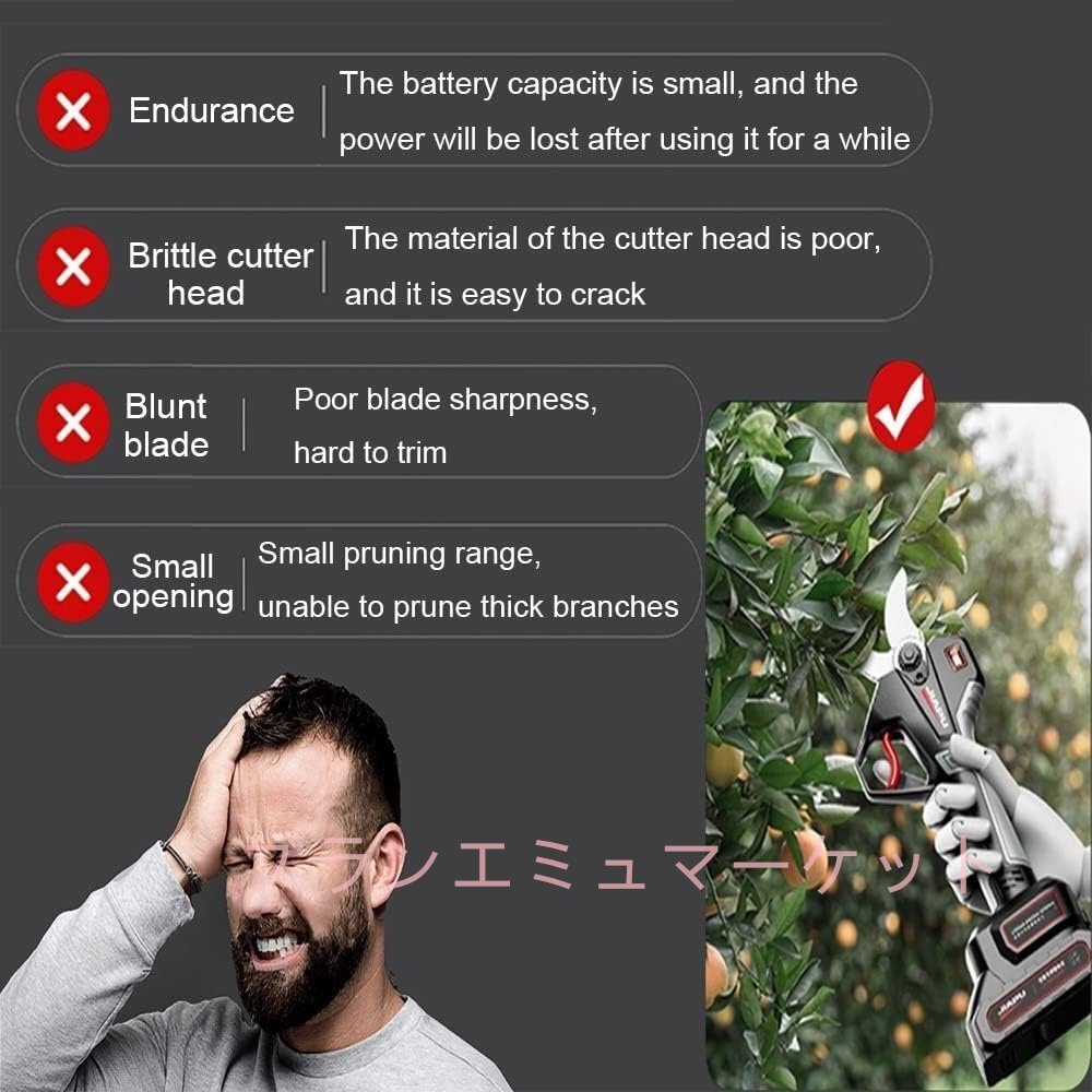 3.大容量リチウム電池:21 V/2 Ahリチウム電池、充電時間1-2時間、庭で仕事をする時、1つの電池は少なくとも6時間連続で仕事をすることができる。羽根は高強度合金鋼から作られ、高温に耐え、破断しにくい。予備刃があり、最大切断直径は50 mmです。