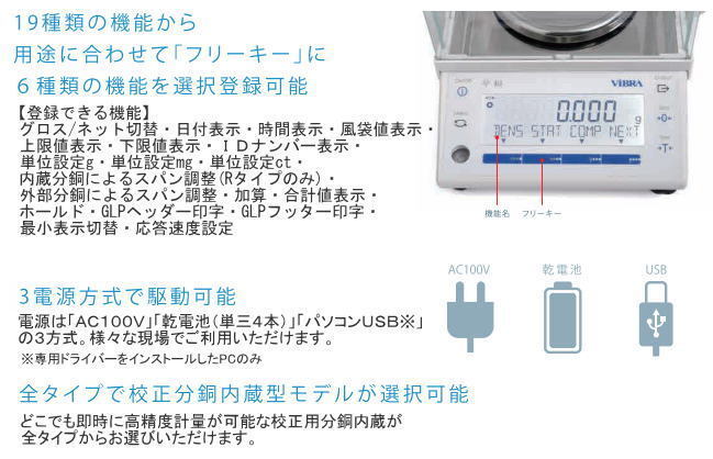 | 【多機能】 | 個数モード、%モード、比重モードなど8種類の計量モードのほか 約30種類の機能を搭載 |